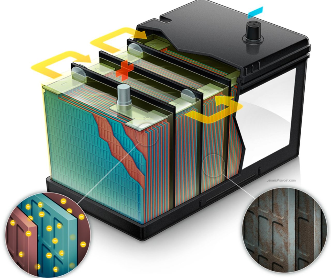 ซัลเฟต ผลึกซัลเฟตขนาดเล็กที่ก่อตัวขึ้น เป็นเรื่องปกติและไม่เป็นอันตราย แต่ ในระหว่างที่ชาร์จไม่เพียงพอ หรือวิ่งนานพอจนไดชาร์จสามารถประจุไฟใส่แบตเตอรี่จนเกือบเต็ม การวิ่งระยะสั้นๆ เป็นประจำ หรือหนักไปในทางจอดมากกว่าขับ ซัลเฟตตะกั่ว จะเปลี่ยนเป็นผลึกที่เสถียรและเกาะบนแผ่นขั้วลบ ทำให้เกิดผลึกขนาดใหญ่ขึ้นฃ กลายเป็นสารออกฤทธิ์ต่อแบตเตอรี่ซึ่งเป็นตัวการที่ทำให้แบตเตอรี่ทำงานลดลง