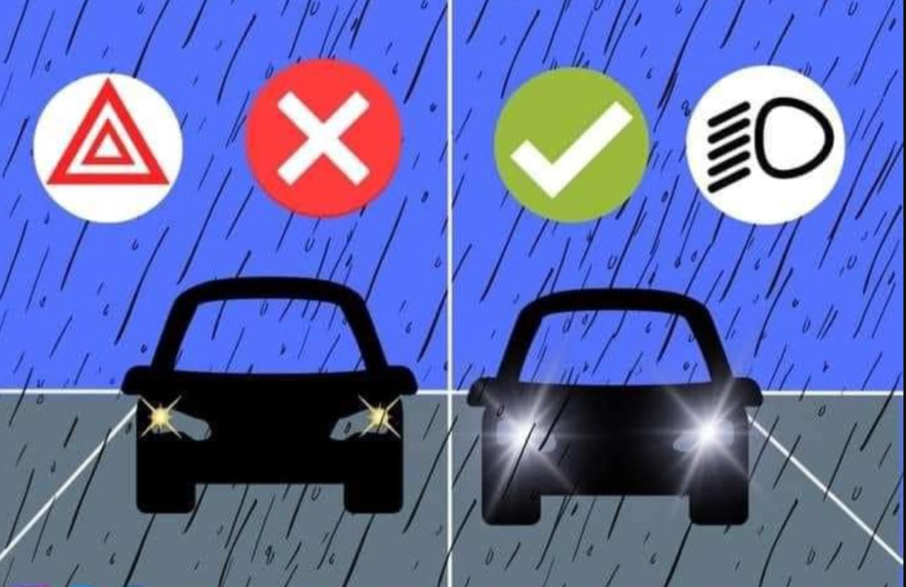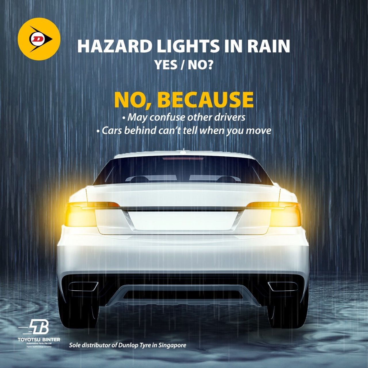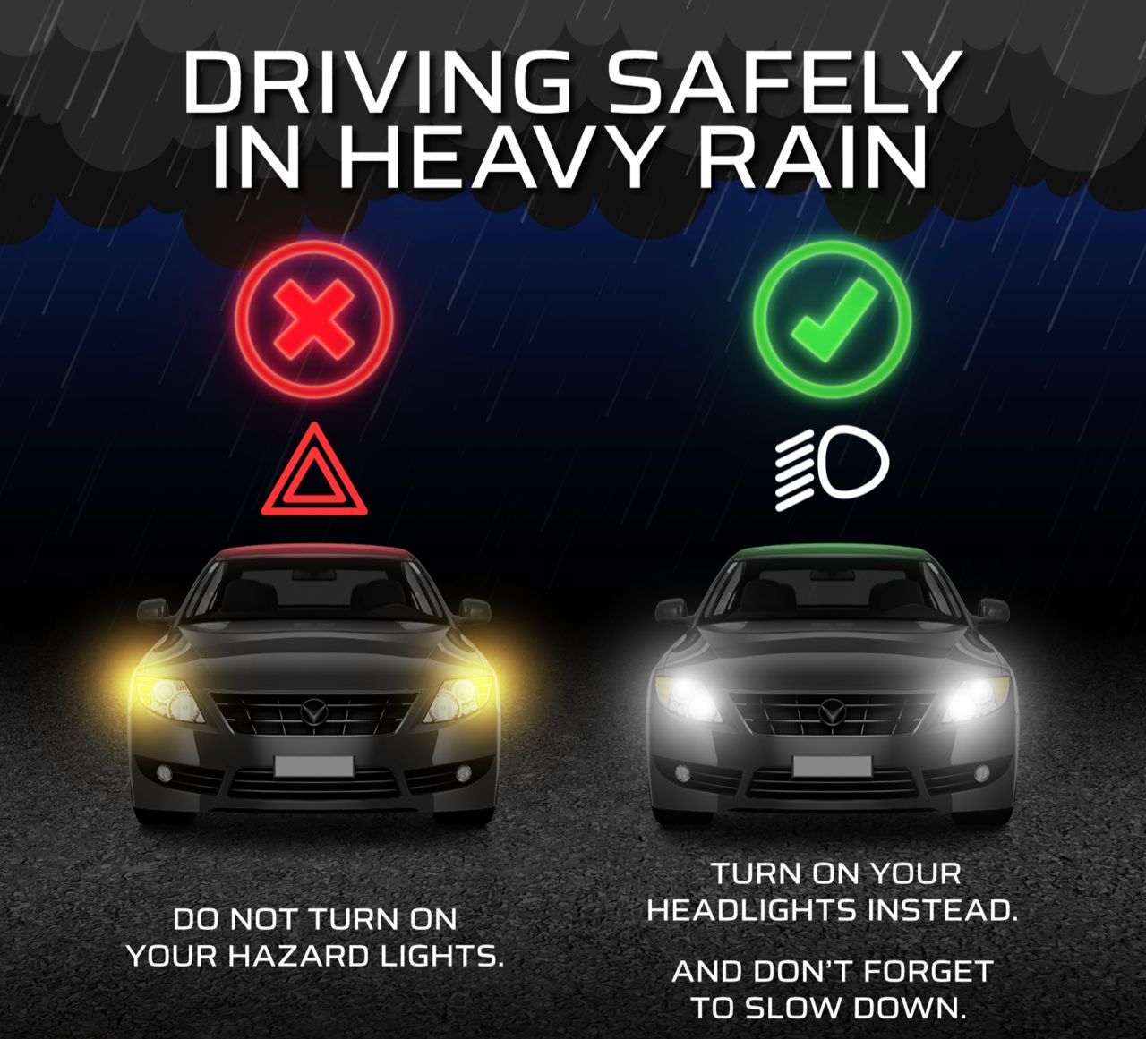 การเปิดไฟกะพริบฉุกเฉินโดยเฉพาะในกรณีที่ฝนตกหนัก แสงจากไฟฉุกเฉินที่กระทบหยดน้ำจะเกิดการหักเหกระทบสายตาผู้ขับขี่ ทำให้เกิดการแสบตา หรือมองเห็นได้ไม่ชัดเจน รวมถึงไม่แน่ใจว่าจอดหรือวิ่งอยู่ ซึ่งอันตรายและอาจทำให้เกิดอุบัติเหตุได้ เมื่อต้องขับรถขณะที่ฝนตกหรือทัศนวิสัยเลวร้าย ควรใช้ความเร็วต่ำ เปิดไฟส่องสว่าง หากหนักมากๆ ก็ให้เปิดไฟตัดหมอกช่วย ใช้ความเร็วต่ำ ไม่ควรเปิดไฟสูง ไม่ควรเปลี่ยนช่องทางโดยไม่จำเป็น ไม่ขับรถจี้ชิดคันหน้ามากจนเกินไป ระยะเบรกในช่วงที่ผิวถนนมีความเปียกชื้นจะเพิ่มมากขึ้น ระวังให้ดีๆ ทิ้งระยะเผื่อเอาไว้จะได้ไม่ไปทิ่มท้ายชาวบ้านหรือจี้ติดจนต้องใช้เบรกหนักแล้วถูกรถคันที่ตามหลังมาหวดท้ายเข้าไปเต็มๆ