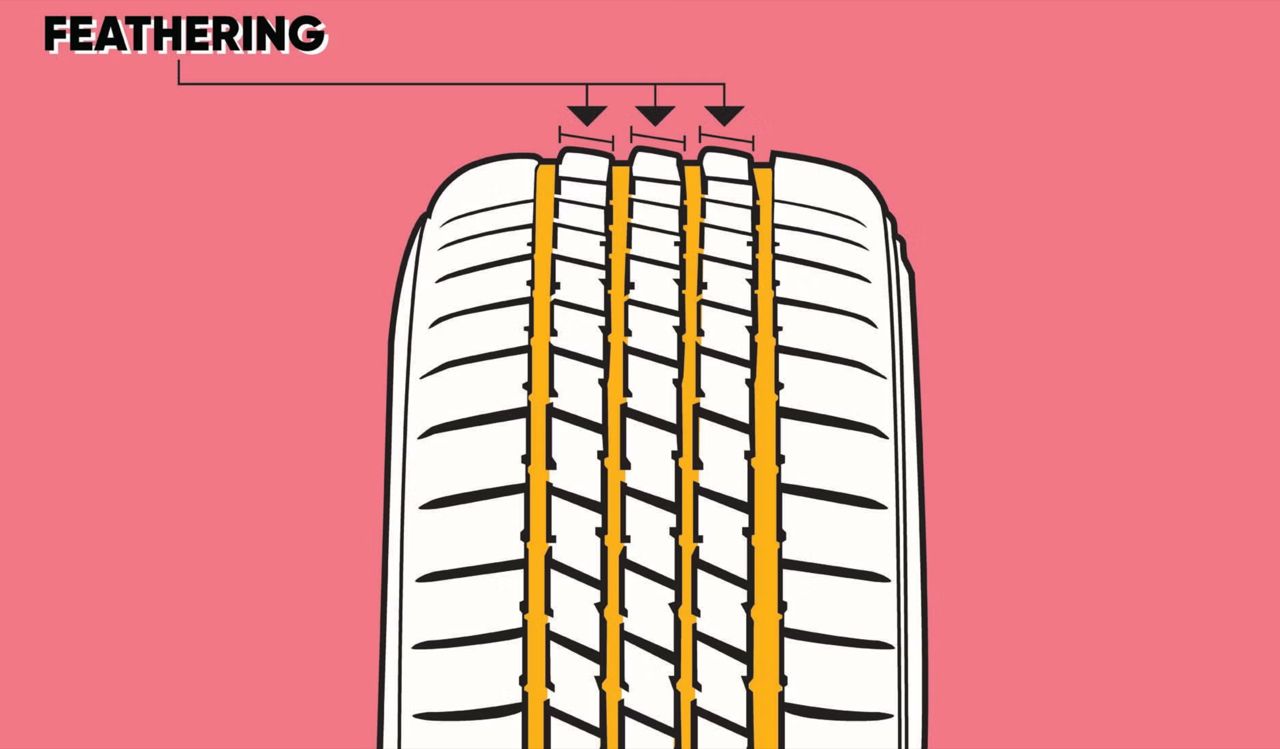 ดอกยางสึกไม่สม่ำเสมอกันเกิดได้จากหลายตัวแปร เช่น มุมแคมเบอร์ การใช้งานหน้ายางเพียงด้านใดด้านหนึ่ง การเติมลมยางหรือเติมลมไนโตรเจนด้วยแรงดันที่ไม่เหมาะสม ช่วงล่างของรถและศูนย์ล้อที่ไม่ถูกต้อง นำไปสู่ความผิดปกติด้านการสึกของยาง ควรได้รับการตรวจสอบโดยช่างเพื่อทำการแก้ใข