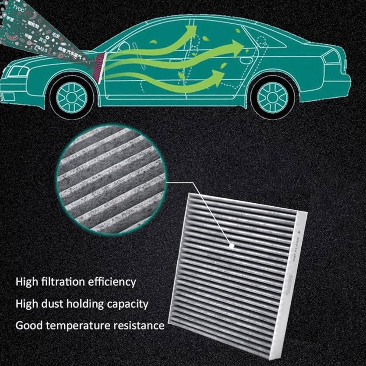 รถยนต์โดยทั่วไปมีไส้กรองอากาศติดตั้งมากับตัวรถยนต์นั่นก็เพื่อทำการดัก และป้องกันมลพิษขนาดเล็กที่สามารถเข้ามาสู่ภายในห้องโดยสารได้ แต่ไส้กรองอากาศก็มีความแตกต่างทั้งในแง่ของคุณภาพและความหนาแน่นของเส้นใยกระดาษไส้กรอง ซึ่งสิ่งเหล่านี้เองเป็นตัวบ่งชี้ประสิทธิภาพของไส้กรองอากาศและการดักจับมลพิษทางอากาศ โดยเฉพาะฝุ่นละอองที่มีค่าระดับ PM 2.5 หรือสูงเกินค่ามาตรฐาน