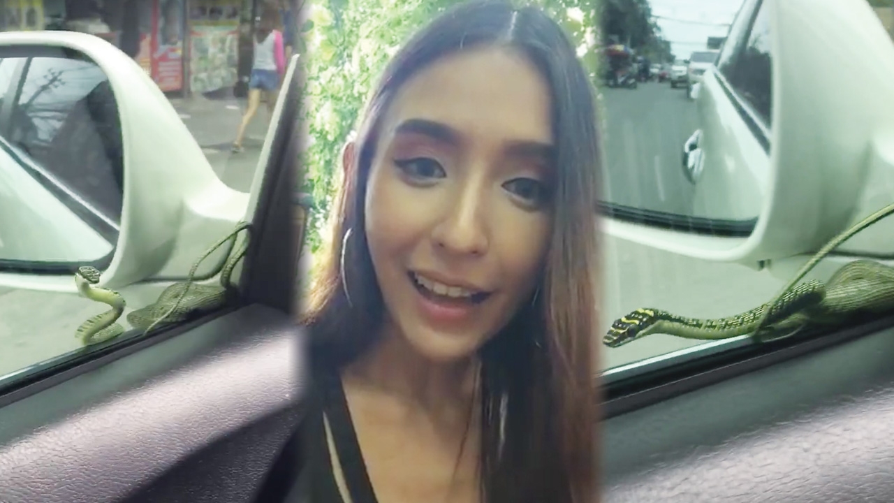 คลิปนี้เป็นคลิปของสาวสวยตาคมคนหนึ่ง ที่ขึ้นมานั่งบนรถ โดยมีแฟนหนุ่มเป็นคนขับรถ ซึ่งสาวสวยถึงกับกรี๊ดแตก เมื่อเห็นเจ้างูสีเขียว ชูหัวไปมา พร้อมเลื้อยอยู่ติดกระจกข้างๆ งานนี้จะเป็นยังไง เมื่อเจ้างูไม่ยอมหนีไปไหน