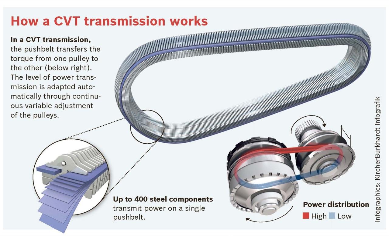 ส่วนเกียร์ CVT ขับเคลื่อนล้อหน้าที่ปรับอัตราทดและความรู้สึกให้เข้ากับแรงบิดที่เทมาจากเครื่องยนต์แล้วไหลลื่นเป็นสายน้ำแต่ยังคงความสนุกในการขับซึ่งทำออกมาได้ใกล้เคียงกับเกียร์ออโต้ฟันเฟืองมากที่สุดก็คือเกียร์ CVT ใน Honda Civic Turbo RS แต่ CVT ส่วนใหญ่ในอีโคคาร์ก็ยังให้ความน่าเบื่อย้วยแตกเหมือนเดิม ต้นทุนที่ต่ำกว่าเกียร์ฟันเฟืองทำให้ CVT ปรากฏอยู่ในรถราคาถูกมากมาย