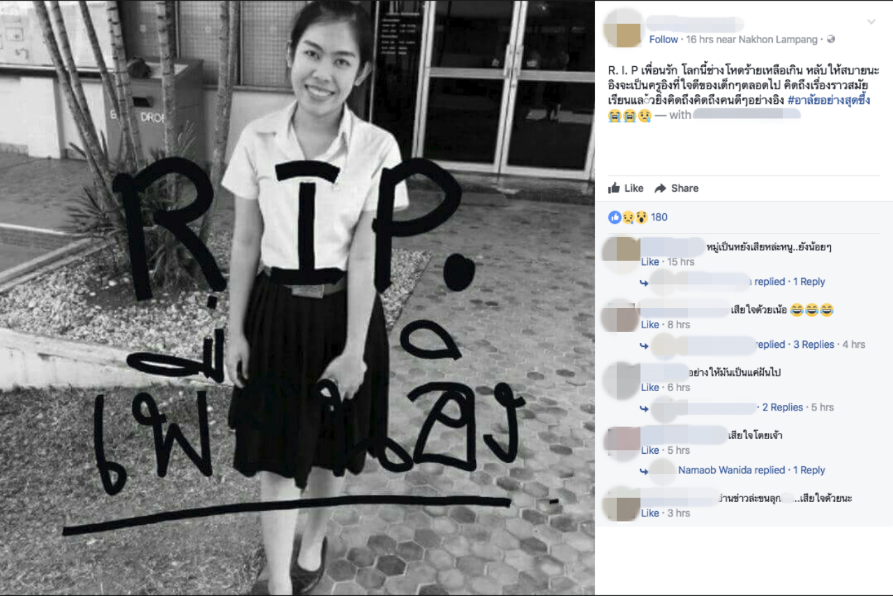 สำหรับ น.ส.นันทรัตน์ เพิ่งได้บรรจุเป็นครูผู้ช่วยที่ อ.แม่สอด ไม่นานมานี้ เป็นคนน่ารัก นิสัยดี เป็นที่รักใคร่ของเพื่อนและผู้บังคับบัญชา ซึ่งหลังที่เพื่อนผู้ตายทราบข่าวก็โพสต์เฟซบุ๊กแสดงความเสียใจและไว้อาลัยผู้ตายกันเป็นจำนวนมาก.