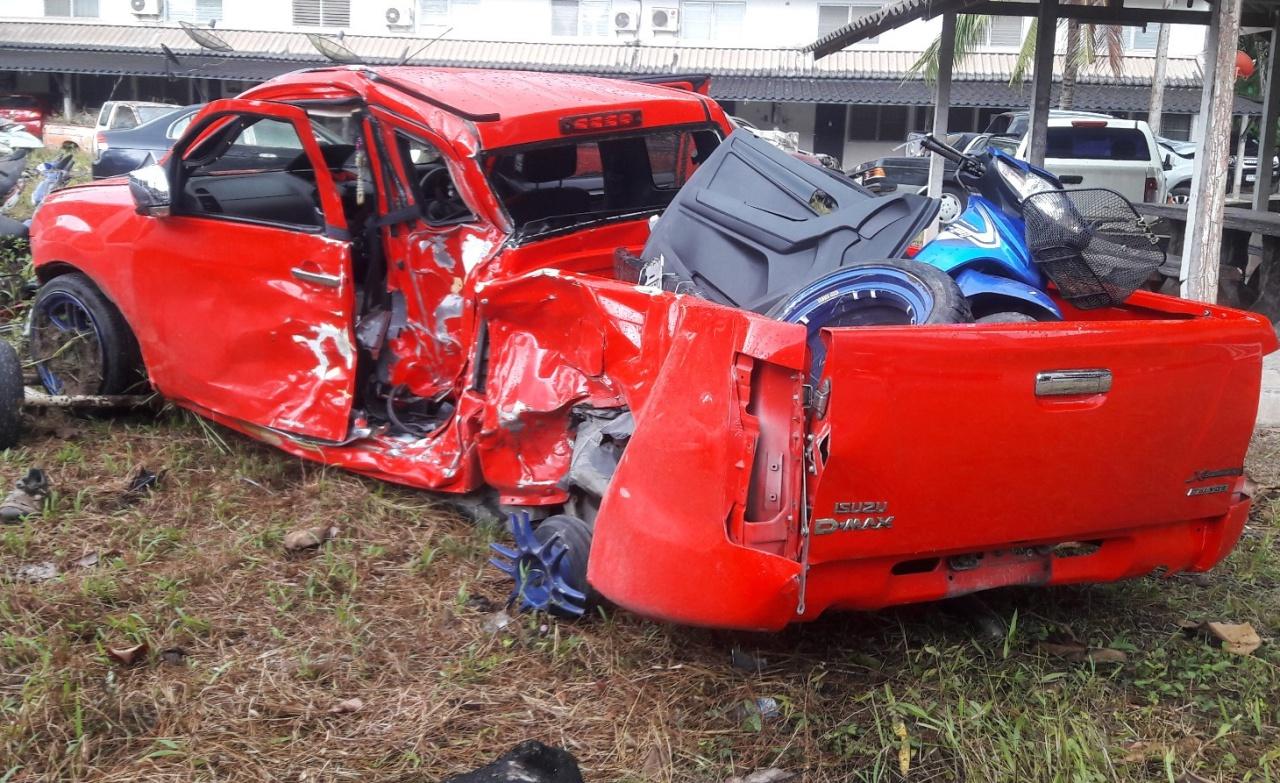 อีกคันเป็นรถกระบะอีซูซุ สีแดง ทะเบียน ฒศ 5905 กรุงเทพมหานคร สภาพด้านหน้าและกลางตัวรถด้านซ้ายถูกชนพังยับ ลักษณะตกลงไปในป่าหญ้าข้างทาง ภายในมีคนเจ็บ 4 คน อาการสาหัส เจ้าหน้าที่ช่วยกันนำส่ง รพ.ทุ่งใหญ่ ประกอบด้วย นายสุรเดช เดชารัตน์ อายุ 36 ปี คนขับ นางสุดา เดชารัตน์ อายุ 34 ปี ภรรยา พร้อมลูกชายอายุ 7 ขวบ และ 2 ขวบ ทั้งหมดเป็นชาวนครศรีธรรมราช ต่อมาเด็กชาย 7 ขวบเสียชีวิตลงที่ รพ.ทุ่งใหญ่ ส่วน นายสุรเดช กับนางสุดา อาการน่าเป็นห่วง แพทย์ส่งไปรักษาต่อยัง รพ.มหาราชนครศรีธรรมราช และในเวลาต่อมา นางสุดา เสียชีวิตระหว่างทาง นอกจากนี้ ในที่เกิดเหตุยังพบรถจักรยานยนต์ ทะเบียน 1 กถ 3771 นครราชสีมา เสียหลักพลิกคว่ำอยู่ริมถนน คนขับขี่คือ นายธนกร จันทวี อายุ 16 ปี ได้รับบาดเจ็บ มูลนิธิช่วยกันนำส่ง รพ.ทุ่งใหญ่