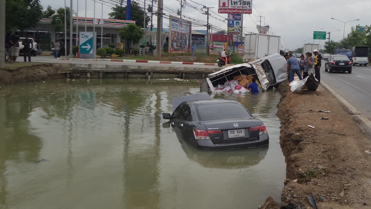 จากการสอบถาม นายเสรี ทราบว่า ขับรถบรรทุกปุ๋ยมาจาก จ.ราชบุรี ถึงที่เกิดเหตุรถโตโยต้า วีออส ที่ขับอยู่ด้านหน้าเบรกกะทันหัน จึงต้องเบรกและหักหลบ ทำให้รถยนต์ฮอนด้า แอคคอร์ด ที่ขับตามหลังมาพุ่งชนตนอย่างแรง จนรถไปกระแทกคันหน้าและเสียหลักตกน้ำ โชคดีที่มีคนมาทุบกระจกช่วยออกมาได้