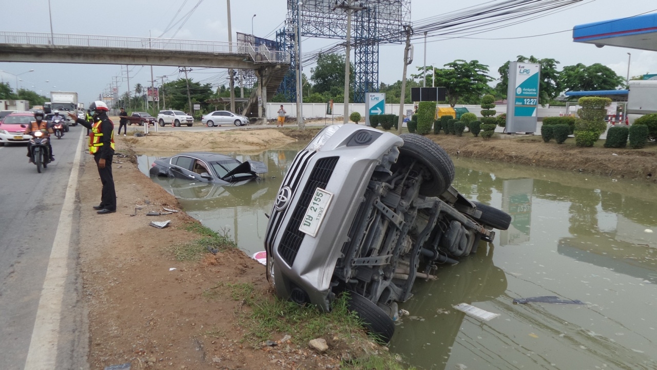 เวลา 11.00 น. วันที่ 12 ก.ค. 60 ร.ต.ท.หญิงชลธิยา มีสกุล รอง สว.สส.สภ.สามพราน จ.นครปฐม รับแจ้งมีอุบัติเหตุรถชนกันและตกลงไปในคูน้ำข้างทาง ที่หน้าปั๊ม NGV ปตท. ถนนบรมราชชนนี กม.22+500 ม.1 ต.ทรงคนอง อ.สามพราน จึงเดินทางไปตรวจสอบพร้อมด้วยตำรวจทางหลวง 1 กองกำกับการ 2 ทหารชุด รส.ช.พัน.9 มูลนิธิป่อเต็กตึ๊ง ที่เกิดเหตุพบรถยนต์ฮอนด้า แอคคอร์ด สีดำ ทะเบียน กบ 626 ราชบุรี สภาพหน้ารถพังยับจมอยู่ในน้ำ มี นายรัทธพล บุญพร้อม อายุ 62 ปี ชาวราชบุรี เป็นคนขับ บาดเจ็บบริเวณหน้าอก เจ้าหน้าที่นำส่ง รพ.พุทธมณฑล อีกคันเป็นรถกระบะโตโยต้า รีโว่ ทะเบียน บษ 2155 ราชบุรี บรรทุกปุ๋ยมาเต็มคัน ท้ายรถจมน้ำ ชาวบ้านช่วยกันทุบกระจกหน้ารถช่วย นายเสรี รังทองคำ อายุ 30 ปี คนขับ ออกมาไม่ได้รับบาดเจ็บ ห่างออกไปพบรถยนต์โตโยต้า วีออส สีดำ ทะเบียน กฉ 8625 ราชบุรี ท้ายรถได้รับความเสียหาย มีนายณรงค์ศักดิ์ สุขบุญชูเทพ อายุ 36 ปี ชาวราชบุรี เป็นคนขับ
