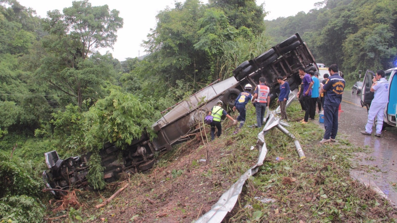 รถพ่วงกลับจากส่งเถ้าลอย หักหลบเก๋งช่วงโค้งลงเขาบนถนนสายลำปาง-เด่นชัย ฝนตกทำลื่นพลิกคว่ำชนราวเหล็กกั้นตกข้างทางหวิดร่วงเหว คนในรถเจ็บ 2