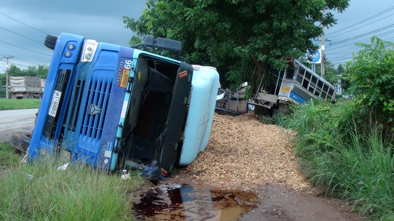 รถพ่วง 18 ล้อขนไม้ยูคาลิปตัสสับเต็มคัน วิ่งฝ่าฝนบนถนนสุวรรณศร ปราจีนบุรี เสียหลักพุ่งชนรถ 6 ล้อ รอรับพนักงานจอดริมถนน และรถชาวบ้าน รวม 4 คัน คนขับเจ็บสาหัส 2 ราย