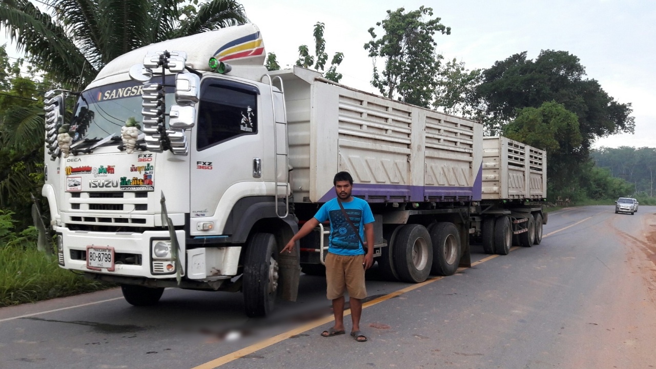 ด้าน นายวุฒิชัย คนขับรถพ่วง ยืนรอให้การกับเจ้าหน้าที่ว่า ขณะขับรถบรรทุกขี้เถ้าสำหรับใช้ผสมทำปุ๋ยโดยมีแฟนสาวนั่งมาด้วยจาก อ.เขาพนม จ.กระบี่ เพื่อจะไปส่งที่ อบต.แห่งหนึ่งใน อ.ทุ่งสง ถึงที่เกิดเหตุสังเกตเห็นผู้หญิงคนหนึ่งเดินออกมาจากข้างทาง เมื่อเห็นรถของตน หญิงคนดังกล่าวก็รีบเดินปรี่เข้าใส่รถ ตนที่มองทางข้างหน้าอยู่เห็นเหตุการณ์อย่างชัดเจน จึงรีบหักพวงมาลัยไปฝั่งขวาพร้อมกับเหยียบเบรกกะทันหัน ทำให้ตัวรถชนจนหญิงคนดังกล่าวล้มลงโดนล้อหน้าด้านซ้ายทับขาดังกล่าว