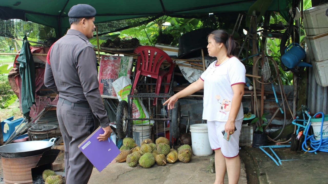 พบ น.ส.พัทชนันท์ เพชรฎา อายุ 45 ปี และนายอนันต์ จูน้อย อายุ 50 ปี เจ้าของบ้านมีอาชีพขายผลไม้ตามฤดูกาล ยืนรออยู่ที่เพิงเก็บผลไม้หน้าบ้าน สอบสวนเบื้องต้นทราบว่า ทั้งสองคนไปซื้อทุเรียนหมอนทองมาจาก ตลาดไทยเจริญ ที่อยู่ใกล้เคียงกับบ้านพักมา 3 ตะกร้าใหญ่ น้ำหนักกว่า 100 กก. มูลค่ากว่า 1 หมื่นบาท ช่วงเวลาประมาณ 23.00 น. วานนี้ (21 ก.ค.) โดยใส่พ่วงข้างรถจักรยานยนต์มา แล้วเอาลงกองไว้รวมกันที่เพิงหน้าบ้าน พอตอนเช้าตื่นมาก็พบว่าทุเรียนที่ซื้อมาเมื่อคืนได้ถูกคนร้ายขโมยไปจนเกือบหมด เหลือแต่ทุเรียนลูกที่แตกและไม่สมบูรณ์เท่านั้น เหมือนตั้งใจคัดทุเรียนเอาแต่ลูกดีๆ ไป จึงได้โทรแจ้งตำรวจทาง 191 เพื่อให้มาตรวจสอบที่เกิดเหตุ เพราะใกล้กับเพิงพักมีร่องรอยเท้าของคนร้ายจำนวนหลายรอย