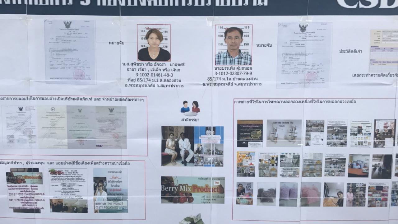 พ.ต.อ.ศิร์ธัชเขต กล่าวว่า การจับกุมดังกล่าวสืบเนื่องจากเมื่อประมาณเดือนพฤษภาคมที่ผ่านมา กลุ่มผู้เสียหายได้เข้าแจ้งความกับพนักงานสอบสวน กก.5 บก.ป.ว่าถูกผู้ต้องหาทั้งสอง หลอกลวงให้ร่วมนำเงินมาลงทุนธุรกิจ หลังจากผู้ต้องหาได้ตั้ง หจก.เบอรี่ มิกซ์ โปรดักส์ รับจ้างผลิตอาหารเสริม และเครื่องสำอางทั่วไป ให้กับลูกค้าที่เป็นเจ้าของแบรนด์สินค้าต่างๆ มีการทำการตลาดโดยโฆษณาผ่านทางสื่อสังคมออนไลน์ ทั้งเฟซบุ๊ก และแอปพลิเคชันไลน์ รวมทั้งสร้างความน่าเชื่อถือโดยการถ่ายรูปคู่กับบุคคลสำคัญ รูปโรงงานที่อ้างว่ามีเครื่องจักรได้มาตรฐาน