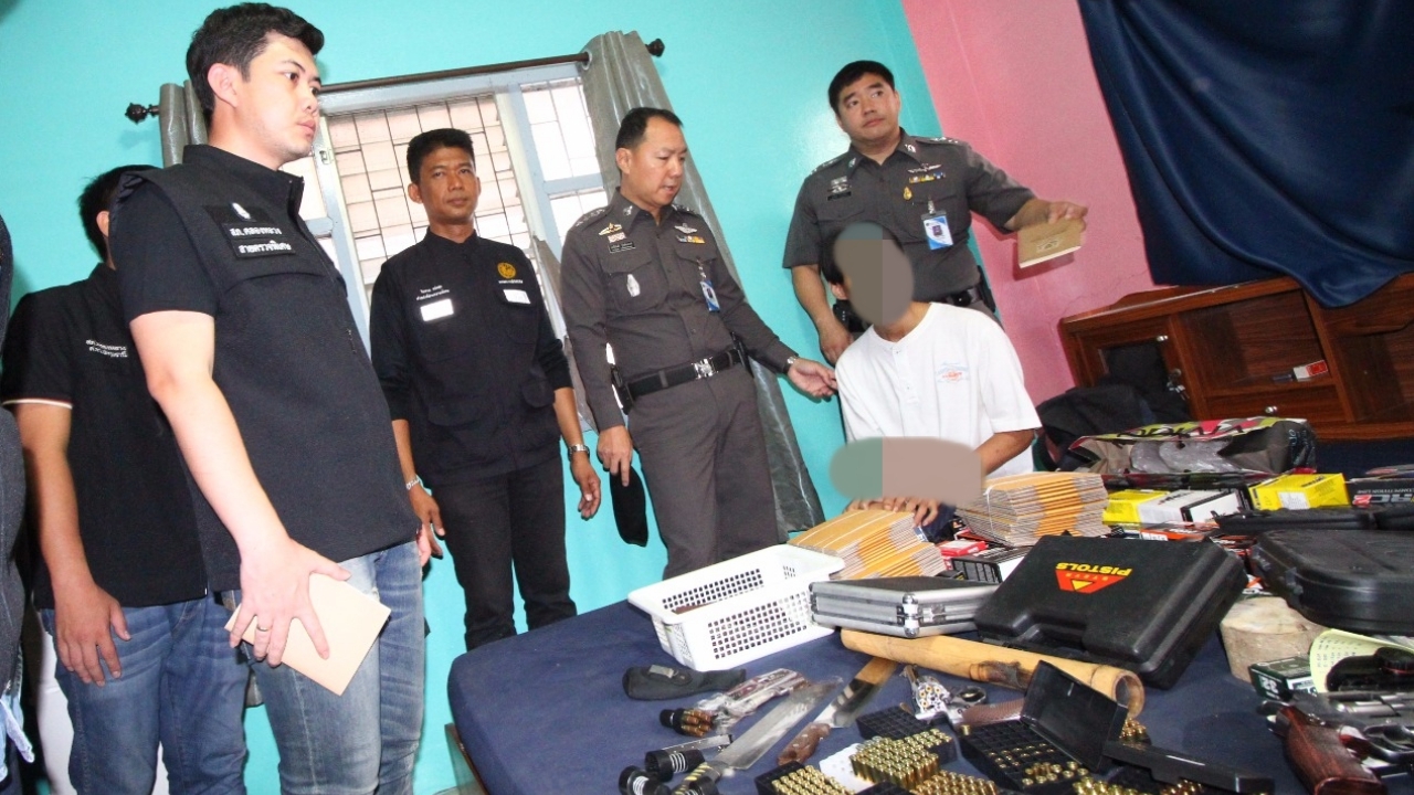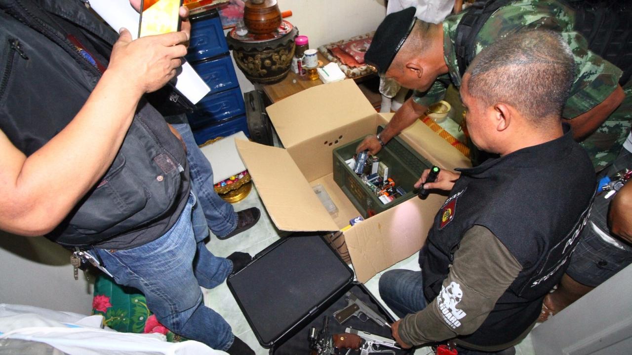 จากการตรวจค้น พบที่ห้องนอนชั้นที่ 2 และ 3 มีการซุกซ่อนอาวุธปืนทั้งอาวุธปืนจริง และปืนดัดแปลงที่อยู่ภายในหัวเตียง และกล่องพลาสติกจำนวนมาก โดยแบ่งเป็นอาวุธปืนจริงไม่มีทะเบียน และปืนดัดแปลงเปลี่ยนลำกล้องจำนวน 20 กว่ากระบอก