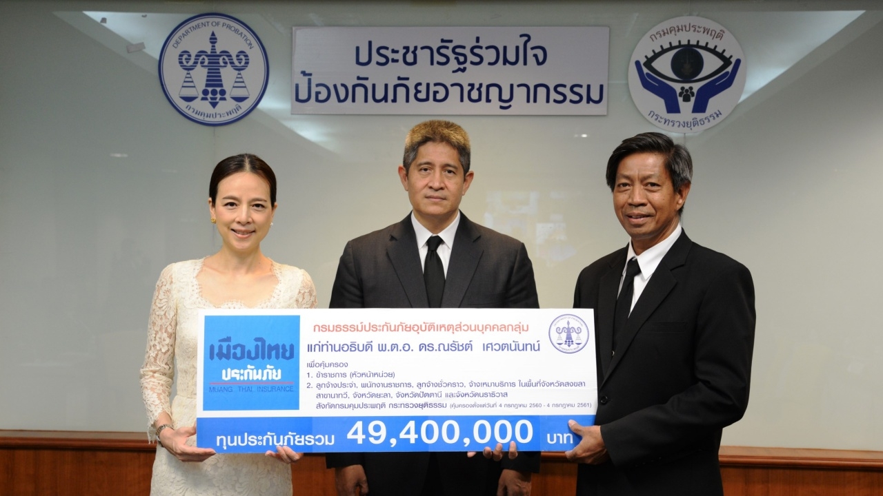 เมื่อเวลา 13.30 น.วันที่ 27 ก.ค.60 ที่ห้องประชุมกรมคุมประพฤติ ชั้น 4 ศูนย์ราชการอาคารเอ ถนนแจ้งวัฒนะ กทม. พ.ต.อ.ณรัชต์ เศวตนันทน์ อธิบดีกรมคุมประพฤติ และนายมณฑล แก้วเก่า หัวหน้าผู้ตรวจราชการกรมคุมประพฤติ รับมอบกรมธรรม์ประกันภัยอุบัติเหตุส่วนบุคคลกลุ่มจาก นางนวลพรรณ ล่ำซำ กรรมการผู้จัดการและประธานเจ้าหน้าที่บริหาร บริษัท เมืองไทยประกันภัย จำกัด (มหาชน) จำนวนทุนประกันภัยรวม 49,400,000 บาท