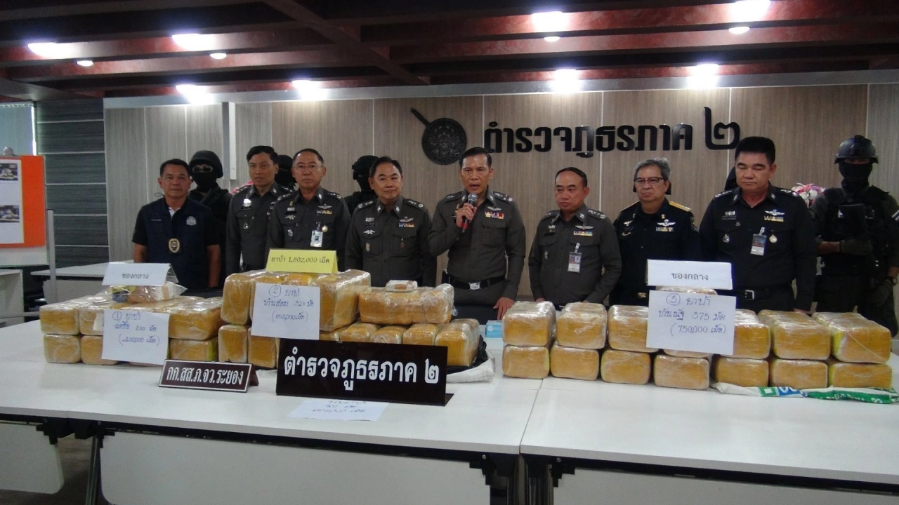 รอง ผบ.ตร. ร่วมผู้บัญชาการตำรวจภูธรภาค 2 แถลงจับ 5 ผู้ต้องหาขบวนการค้าเสพติด ล่อซื้อที่ระยอง 4 แสนเม็ด ตามยึดในบ้าน 2 หลังที่อยุธยาเพิ่มอีก รวมแล้วเกือบ 2 ล้านเม็ด ลอตใหญ่สุดของปีในภาคตะวันออก เร่งขยายผลถึงต้นทาง