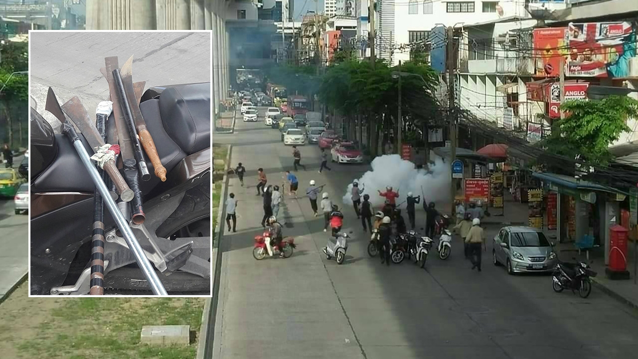 ห้าวไม่เลิก! ช่างกลยกพวกตีกัน ปาระเบิดสนั่นบริเวณซอยข้างปั๊มน้ำมัน หน้ามหาวิทยาลัยสยาม สน.ภาษีเจริญ รีบเข้าระงับเหตุ เจอทั้ง สปาต้า ดายหญ้า อีดาบทิ้งเกลื่อน มีผู้ได้รับบาดเจ็บ 2 ราย แขนขาด และศีรษะแตก