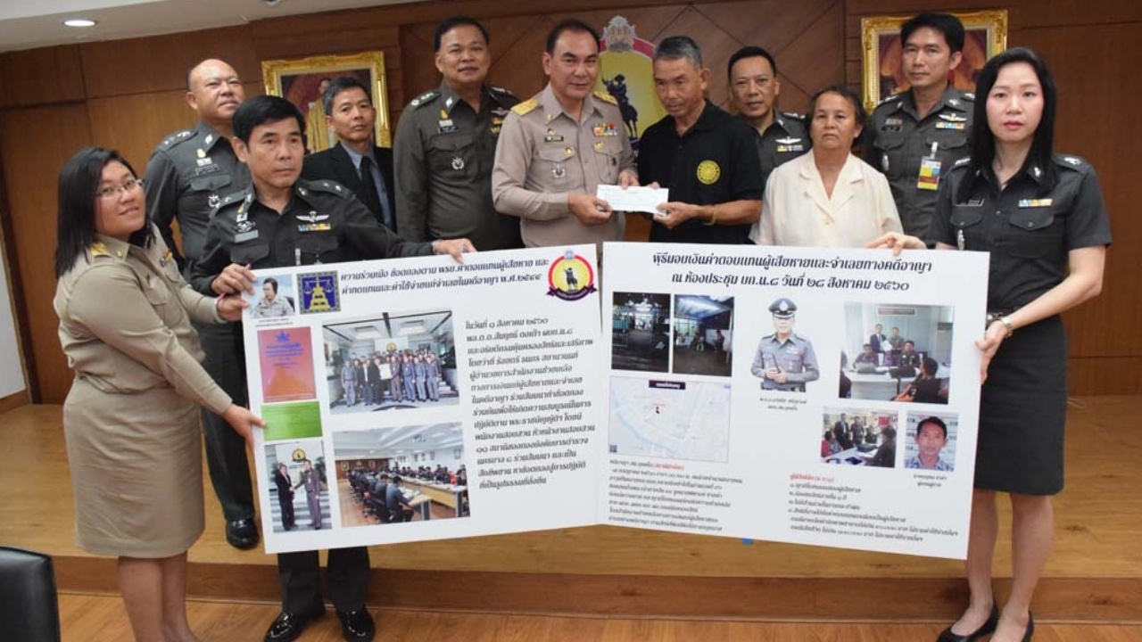 เมื่อเวลา 10.30 น. วันที่ 28 ส.ค.60 ที่กองบังคับการตำรวจนครบาล 8 พล.ต.ต.สัมฤทธิ์ ตงเต๊า ผบก.น.8 พร้อม ว่าที่ร้อยตรี ธนกร สถานานนท์ ผอ.สำนักงานช่วยเหลือทางการเงินแก่ผู้เสียหายและจำเลยในคดีอาญา กระทรวงยุติธรรม และ พ.ต.อ.ธวัชชัย ศรีสุรางค์ ผกก.สน.บุคคโล ร่วมมอบเงิน จำนวน 110,000 บาท ช่วยเหลือเยียวยาแก่ นายบุญทม ชายคำ อายุ 62 ปี และ นางหนูพิน ชายคำ อายุ 62 ปี สามีภรรยา ชาว จ.สกลนคร ซึ่งบุตรชายเสียชีวิตจากการถูกกระสุนปืนลูกหลงจากเหตุทะเลาะวิวาทกันภายในซอยสมเด็จพระเจ้าตากสิน 44 แขวงบุคคโล เขตธนบุรี เมื่อวันที่ 7 ก.ค.ที่ผ่านมา