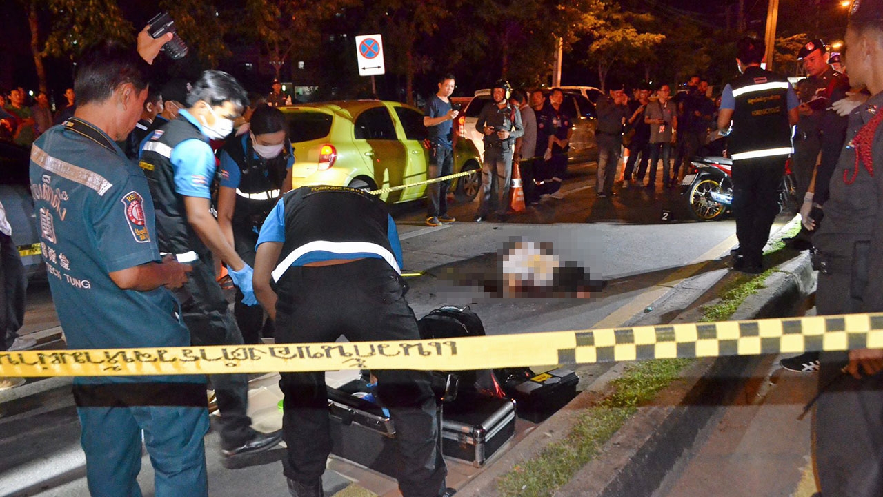 ตำรวจกองพิสูจน์หลักฐานกั้นจุดเกิดเหตุคนร้ายยิงศีรษะนายศิวกร สะอิ้งรำ ชาว จ.บุรีรัมย์ นักศึกษาวิทยาลัยเทคโนโลยียานยนต์บางนา บนถนนเสรีไทย เสียชีวิต ก่อนถึงแยกนิด้า 100 ม. เพื่อตรวจหาหลักฐาน คาดเหตุขัดแย้งระหว่างสถาบัน.