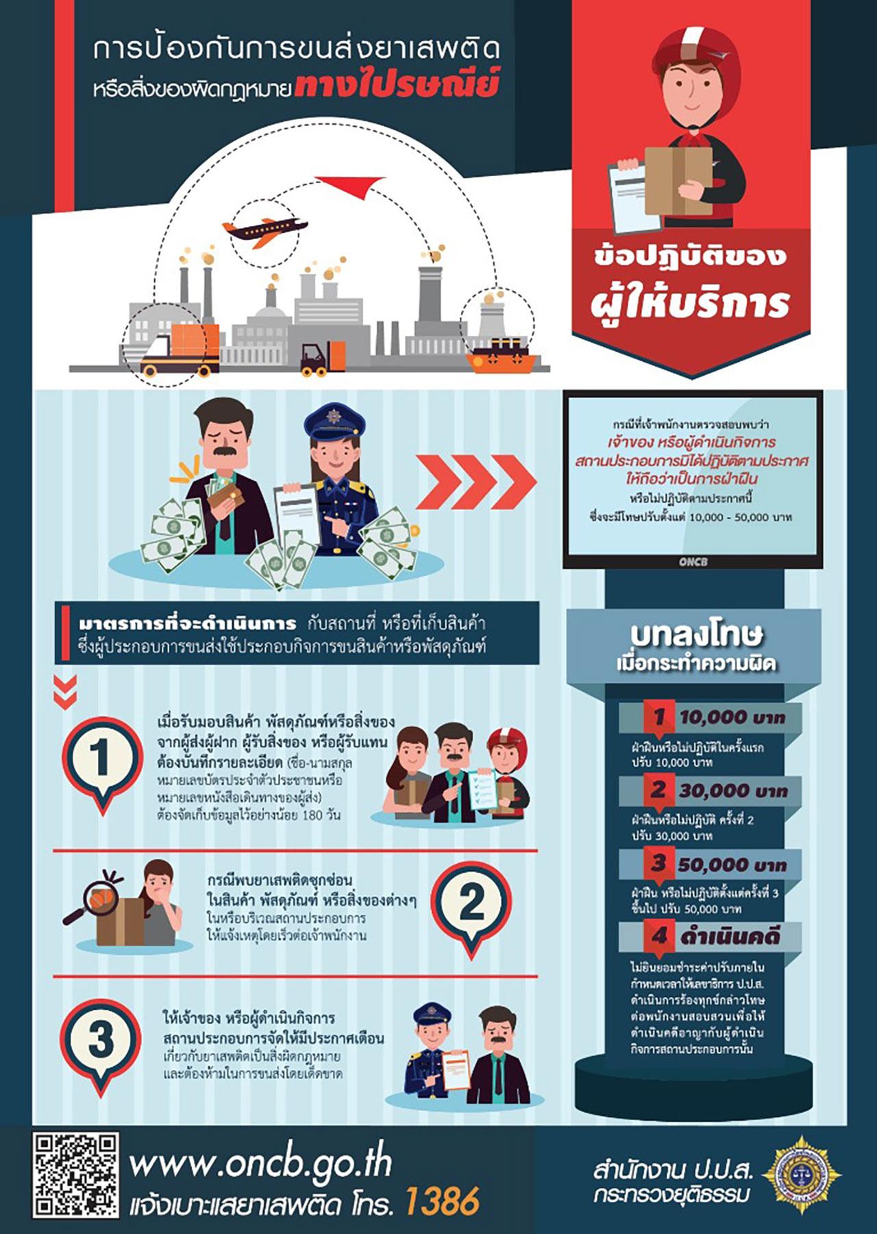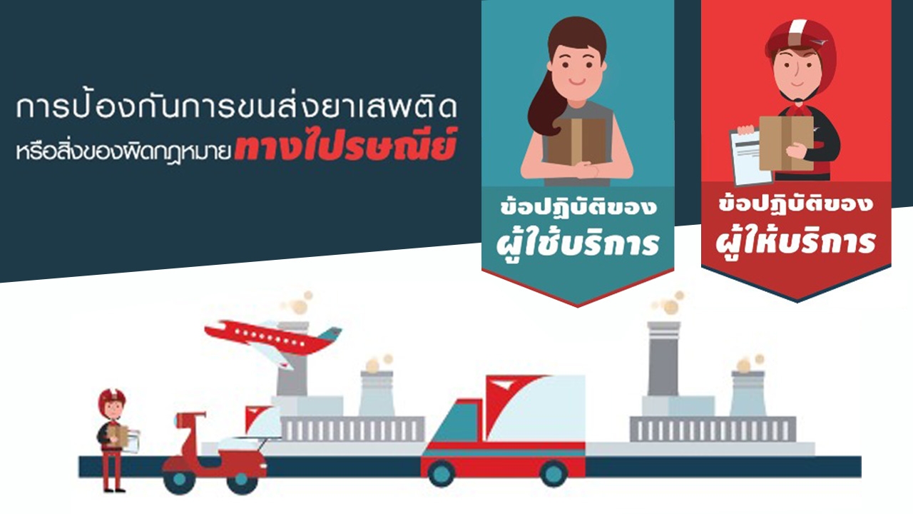 ทั้งนี้ สำนักงาน ป.ป.ส. ได้เผยแพร่ประชาสัมพันธ์ โดยผลิตสื่อ INFOGRAPHIC และจัดพิมพ์ในรูปแบบโปสเตอร์ จำนวน 2 แบบ เพื่อสร้างการรับรู้ให้กับเจ้าหน้าที่ผู้ปฏิบัติงาน หน่วยงานราชการ หมู่บ้าน/ชุมชน และสำหรับผู้ที่สนใจสามารถดาวน์โหลดสื่อดังกล่าวได้ที่ เว็บไซต์ สำนักงาน ป.ป.ส. www.oncb.go.th เพื่อสร้างการรับรู้ให้กับเจ้าหน้าที่ผู้ปฏิบัติงาน พร้อมข้อควรปฏิบัติสำหรับประชาชน ไม่ให้กระทำความผิดและไม่ตกเป็นเหยื่อในการรับฝากส่งพัสดุไปรษณีย์ และหากพบเห็นว่ามีการกระทำความผิดเกี่ยวกับยาเสพติด ไม่ว่าจะเป็นการซื้อ-ขาย หรือกรณีผู้ดำเนินกิจการสถานประกอบการรายใดมีพฤติการณ์ฝ่าฝืน สามารถแจ้งเข้ามาได้ที่สายด่วน สำนักงาน ป.ป.ส. 1386 ตลอด 24 ชม”