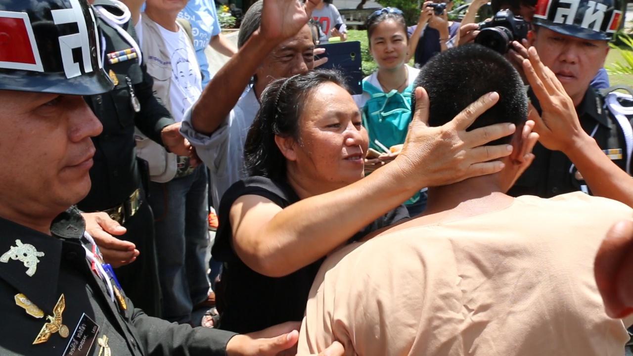 ศาลทหารขอนแก่น เบิกตัว ไผ่ ดาวดิน มาขึ้นศาลเพื่อสืบพยานโจทก์ แต่พยานไม่มา โดยทันทีที่ถึงศาล คนในครอบครัวรวมไปถึงผู้ที่มาให้กำลังใจต่างพากันวิ่งเข้ากอด ทำให้ สห.ต้องห้ามไม่ให้ชุลมุน...