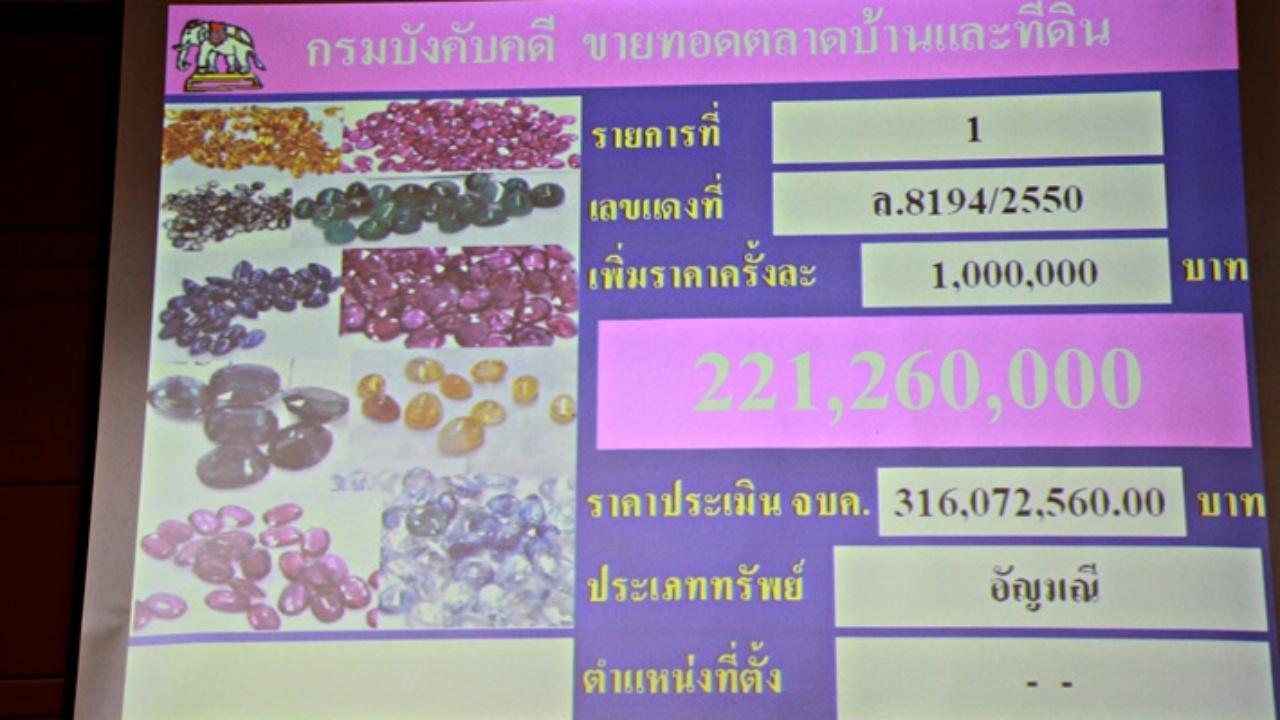 วันที่ 30 ก.ย.60 กรมบังคับคดีเปิดการขายทอดตลาดทรัพย์ในคดีล้มละลาย หมายเลขคดีแดงที่ ล.8194/2550 ประเภทวัตถุลักษณะคล้ายหยก และวัตถุลักษณะคล้ายพลอย ในนัดที่ 6 ของกองบังคับคดีล้มละลาย 4 โดยประมูลด้วยราคาเริ่มต้นที่ 70% ของราคาที่กำหนด โดยคณะกรรมการกำหนดราคาทรัพย์ที่ 316,072,560 บาท เป็นจำนวน 221,260,000 บาท ณ ห้องขายทอดตลาด อาคารอสีติพรรษ กรมบังคับคดี โดยมีนางสาวรื่นวดี สุวรรณมงคล อธิบดีกรมบังคับคดี นายทรงธรรม พูนเกษมทรัพย์ รองอธิบดีกรมบังคับคดี นางทัศนีย์ เปาอินทร์ ผู้อำนวยการกองบังคับคดีล้มละลาย 4 และคณะผู้บริหารกรมบังคับคดีไปร่วมดูแลการปฏิบัติหน้าที่ของเจ้าหน้าที่ภายในงาน