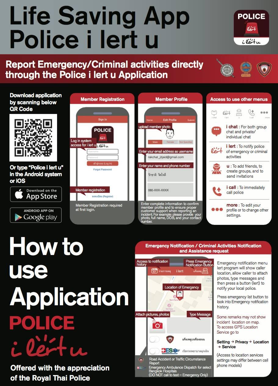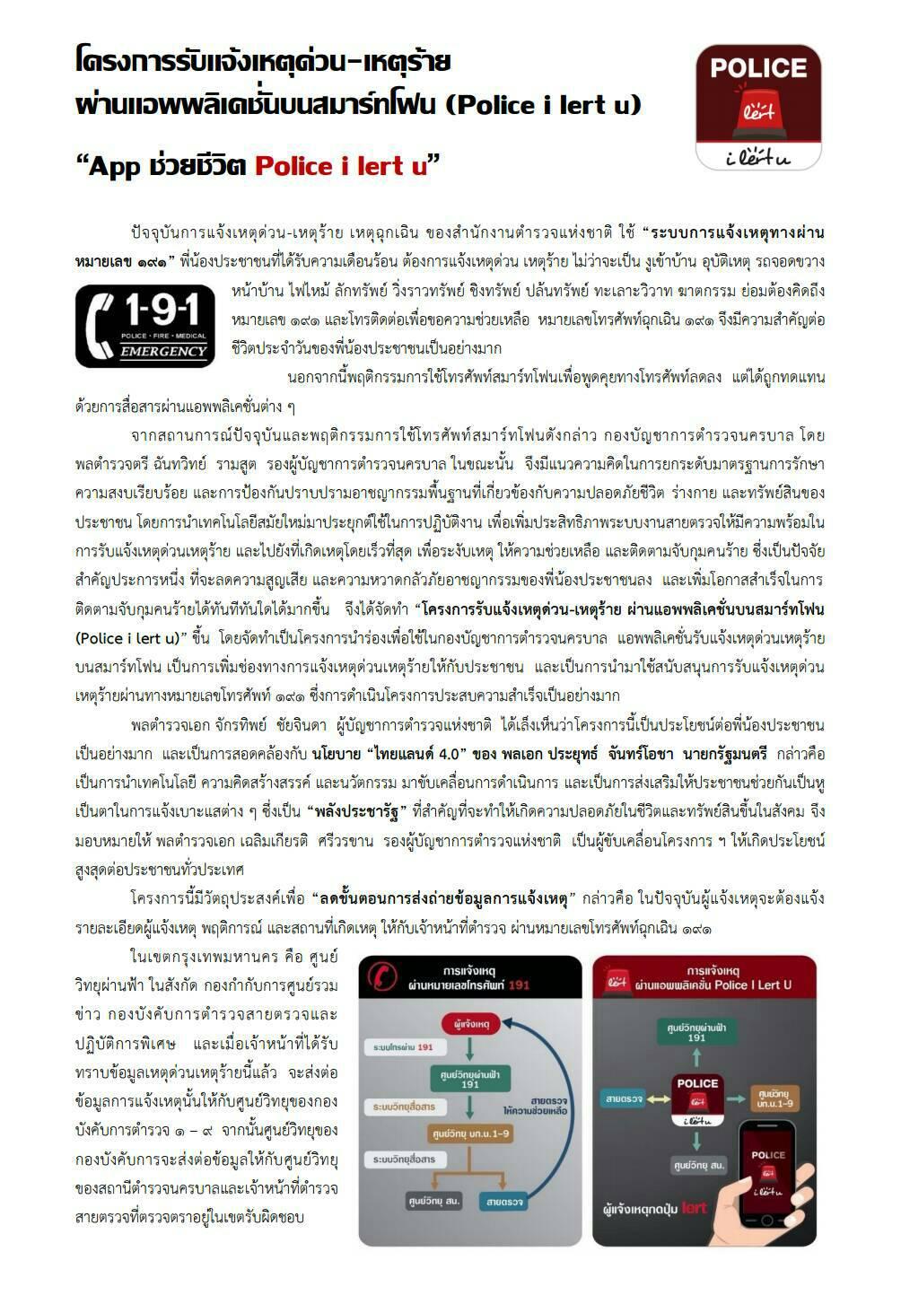 แอปพลิเคชันสุดเจ๋ง "Police i lert u" อีกหนึ่งทางเลือกตอบโจทย์ยากเป็นเรื่องง่าย ที่ทางกองบัญชาการตำรวจนครบาล ได้คิดค้นออกมาสนองรองรับยุคดิจิตอล เพื่อประชาชนที่มีความรู้ความเข้าใจด้านเทคโนโลยีล้ำสมัย เปิดใช้แล้วในเขตพื้นที่กรุงเทพมหานคร ทั้ง 9 กองบังคับการตำรวจนครบาล และพื้นที่ 88 สน.ทั่วกรุงเทพฯ ภายใต้ความต้องการอยู่บนพื้นฐาน "รวดเร็วเข้าถึง ไม่ต้องสื่อสารผ่านโทรศัพท์ แอปพลิเคชันเดียวจบ ครบทุกการสื่อสารชั่วโมงเร่งด่วน จ่อพัฒนาอย่างไม่หยุดยั้ง ตามความสอดคล้องรองรับใช้งานของประชาชน"