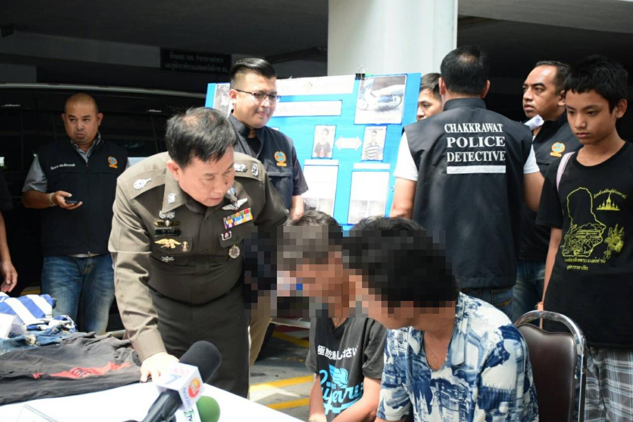 เมื่อเวลา 11.30 น. วันที่ 12 ต.ค. ที่สน.จักรวรรดิ พล.ต.ต.ดุสิต สมศักดิ์ รรท.ผบก.น.6 พ.ต.อ.โชคชัย คณะเจริญ ผกก.สน.จักรวรรดิ พ.ต.ท.พงศ์นรินทร์ เหล่าเขตกิจ รอง ผกก.สส.สน.จักรวรรดิ พร้อมเจ้าหน้าที่ฝ่ายสืบสวน แถลงจับกุมนายศักดิ์พล หรือหมู โสภาทุม อายุ 20 ปี, นายโสพล หรือบาส คงสวัสดิ์ อายุ 19 ปี นายต้อม (นามสมมติ) อายุ 15 ปี และนายโจ้ (นามสมมติ) อายุ 16 ปี ข้อหาร่วมกันปล้นทรัพย์ในเวลากลางคืน พร้อมของกลางรถจักรยานยนต์ ยี่ห้อฮอนด้า รุ่นซุปเปอร์คัพ สีน้ำเงิน-ขาว ทะเบียน 6 กฬ 6469 กรุงเทพมหานคร รถจักรยานยนต์ ยี่ห้อยามาฮ่า รุ่นมีโอ สีแดง-ขาว ทะเบียน 4กฎ 160 กรุงเทพมหานคร มีดปลายแหลมทำครัว 1 เล่ม ประแจเหล็ก 1 อัน และเสื้อผ้าวันก่อเหตุ จับกุมได้ที่บริเวณริมถนนพุทธทณฑลสาย 1 แขวงบางระมาด เขตตลิ่งชัน กทม.