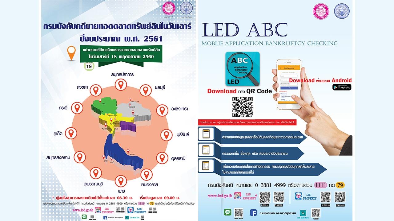 "7.สำนักงานบังคับคดีจังหวัดเชียงใหม่ สาขาฝาง 8.สำนักงานบังคับคดีจังหวัดสุพรรณบุรี 9.สำนักงานบังคับคดีจังหวัดสมุทรสงคราม 10.สำนักงานบังคับคดีจังหวัดภูเก็ต 11.สำนักงานบังคับคดีจังหวัดกระบี่ และ 12.สำนักงานบังคับคดีจังหวัดสงขลา สำหรับผู้ที่สนใจสามารถลงทะเบียนได้ตั้งแต่เวลา 08.30 น. เริ่มประมูลเวลา 10.00 น. หรือติดต่อสอบถามได้ที่กรมบังคับคดี หมายเลข 0-2881-4999 หรือสายด่วน 1111 กด 79 และสำนักงานบังคับคดีทั่วประเทศ หรือดูรายละเอียดเพิ่มเติมที่ www.led.go.th" น.ส.รื่นวดี กล่าว.