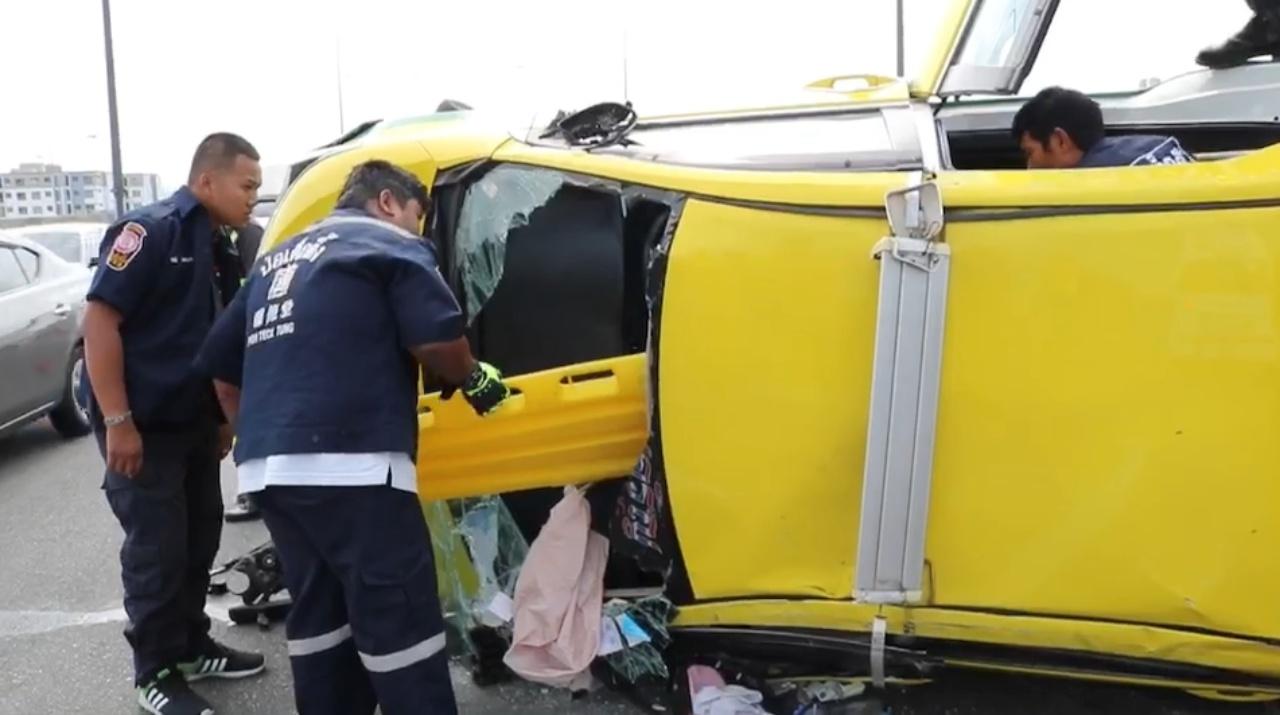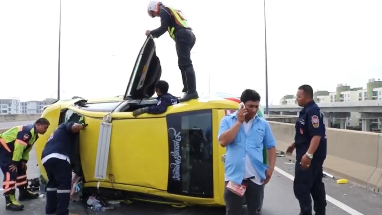 เกิดอุบัติเหตุรถแท็กซี่เสียหลักพลิกคว่ำบนด่วนโทลล์เวย์ บริเวณเหนือวัดหลักสี่ ผู้โดยสารเป็น 2 สาวชาวญี่ปุ่นได้รับบาดเจ็บ โชเฟอร์อ้างโดนรถอีกคันเบียด ตร.วิภาวดี เร่งเคลื่อนย้าย...