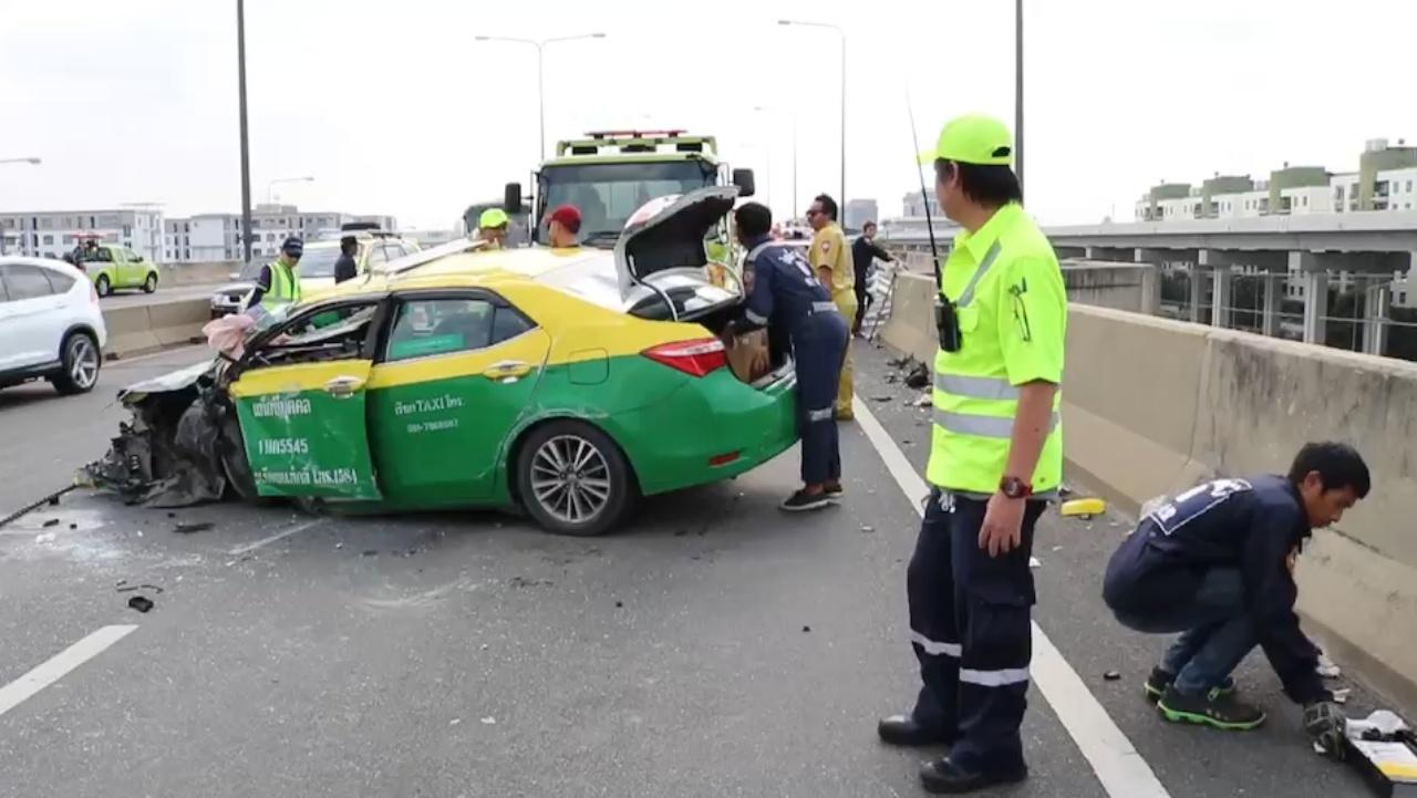 ที่เกิดเหตุ พบรถแท็กซี่ส่วนบุคคล ยี่ห้อโตโยต้า สีเหลืองคาดเขียว หมายเลขทะเบียน 1 มก 5554 กรุงเทพมหานคร ลักษณะตะแคงข้าง อยู่บริเวณเลนกลาง โดยมีผู้ที่ใช้เส้นทางพบเห็นได้ช่วยกันนำผู้บาดเจ็บออกไปก่อนหน้านี้ โดยทราบชื่อผู้ขับขี่ชื่อนายจริณ เจริญสุข อายุ 38 ปี ได้รับบาดเจ็บเล็กน้อย ส่วนผู้บาดเจ็บเป็นหญิงต่างชาติ ชาวญี่ปุ่น จำนวน 2 ราย ถูกนำส่งโรงพยาบาลใกล้เคียง โดยหลังเกิดเหตุทางเจ้าหน้าที่ได้นำรถยกมาเคลื่อนย้ายไปยัง สน.วิภาวดี เนื่องจากกลัวว่าจะมีอุบัติเหตุซ้ำซ้อน และปัญหาการจราจรที่ติดสะสม