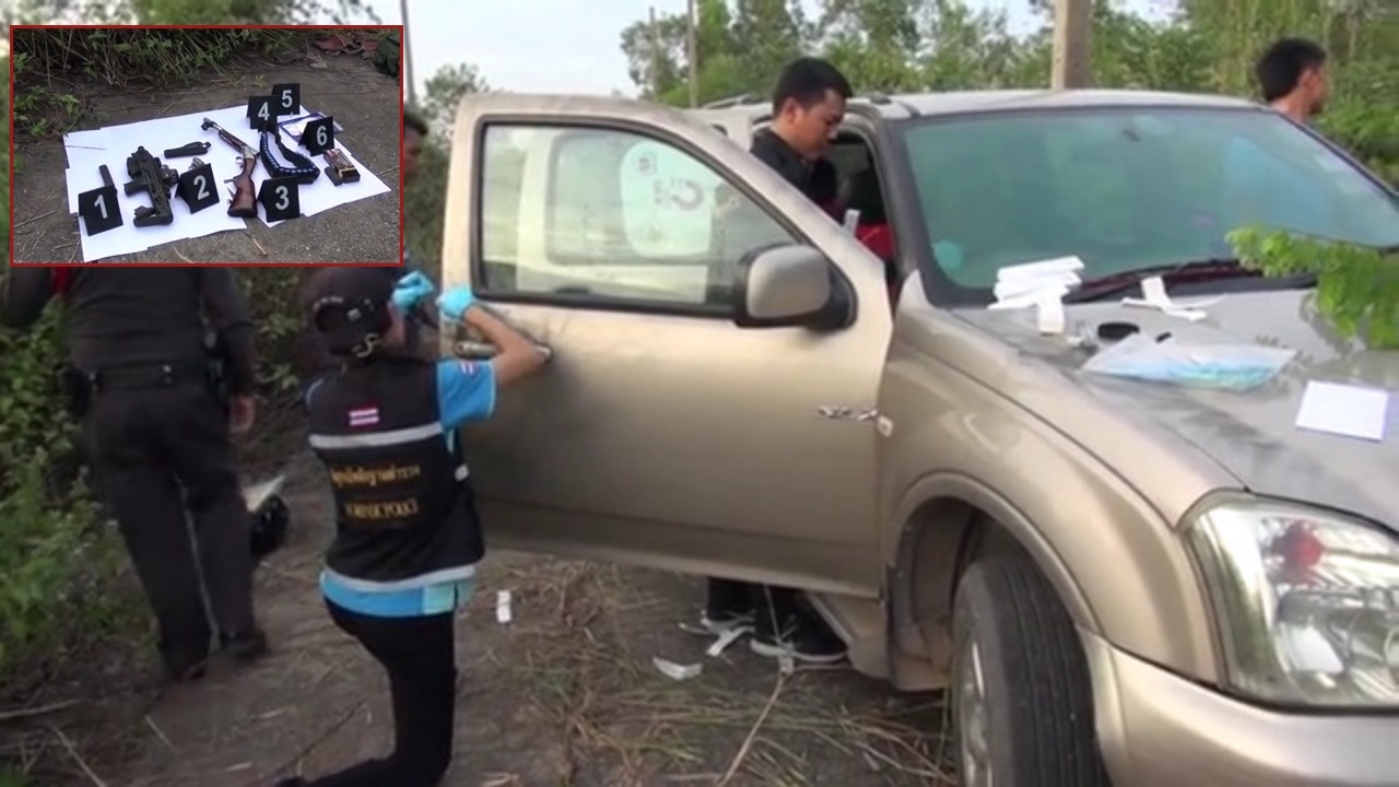 พ.ต.อ.นิพนธ์ กล่าว่า เบื้องต้นพบอาวุธปืนขนาด 9 มม. แบบออโตเมติก และปืนพกสั้นลูกโม่ ลูกซองยาว 1 กระบอก พร้อมเครื่องกระสุน ซึ่งยังไม่พบอาวุธปืนที่ก่อเหตุ โดยจะส่งอาวุธปืนและเครื่องกระสุนตรวจสอบลายนิ้วมือและเลขทะเบียน อย่างไรก็ตามขณะนี้รู้ตัวผู้ก่อเหตุแล้ว เป็นชาวอำเภอบางปะอิน จ.พระนครศรีอยุธยา และได้ออกหมายจับเป็นที่เรียบร้อยแล้ว