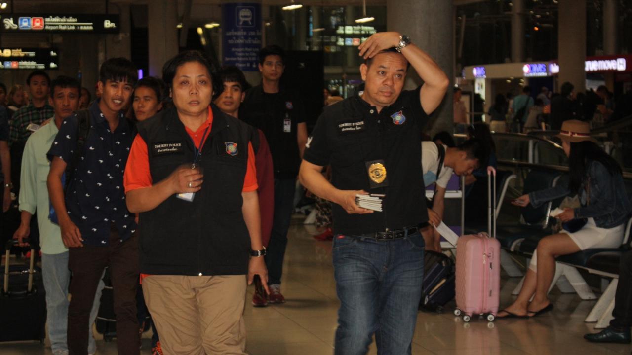 พล.ต.ต.สุรเชษฐ์ หักพาล รรท.รอง ผบช.ทท. พร้อม นายกิตติพงษ์ กิตติขจร รองผอ.ท่าอากาศยานสุวรรณภูมิ และเจ้าหน้าที่ตำรวจ ท่องเที่ยวท่าอากาศยานสุวรรณภูมิ ตำรวจตรวจคนเข้าเมือง สภ.ท่าอากาศยานสุวรรณภูมิ ร่วมกันแถลงข่าวรับตัวคนไทย 9 คนที่โดนส่งกลับจากประเทศกัมพูชาโดยอ้างว่าถูกหลอกให้ไปทำงานแก๊งคอลเซ็นเตอร์ โดยเดินทางมากับสายการบินไทย เที่ยวบิน TG585 ณ ที่ทำการตำรวจท่องเที่ยวชั้น 2 อาคารผู้โดยสาร ท่าอากาศยานสุวรรณภูมิ อ.บางพลี จ.สมุทรปราการ
