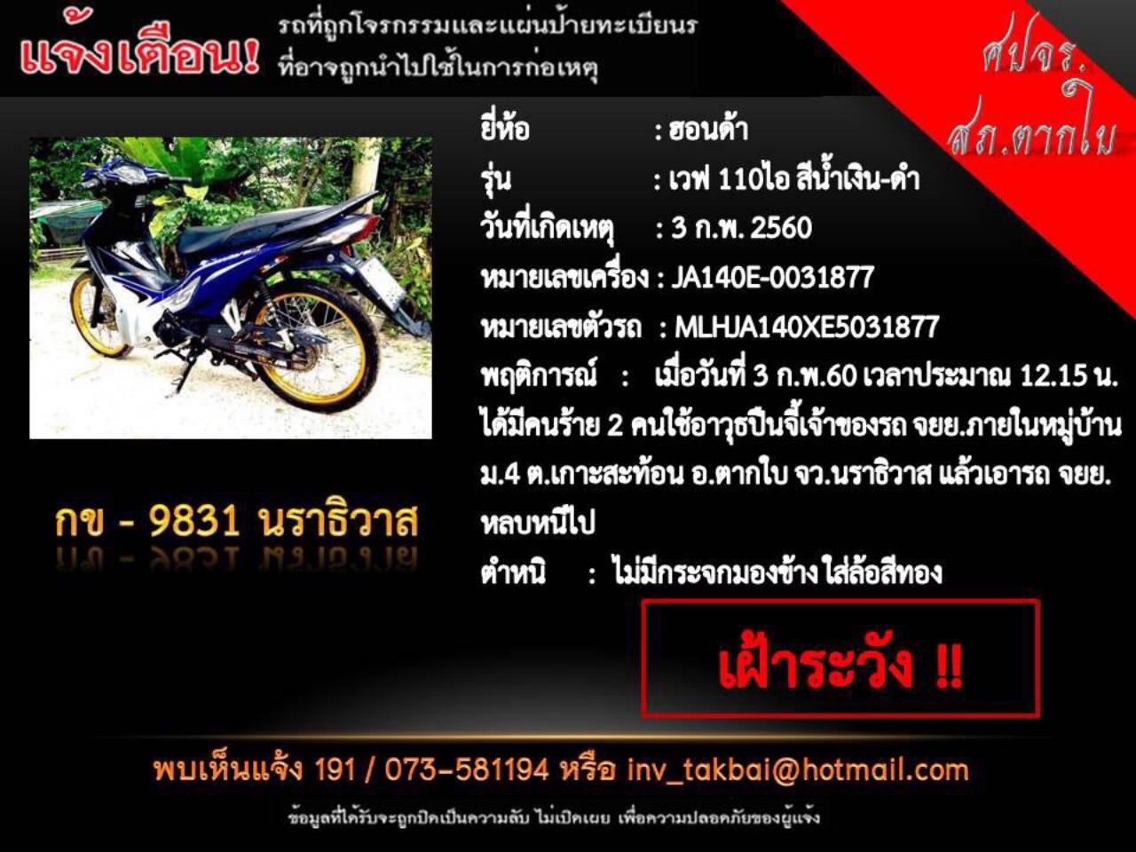 รถจักรยานยนต์ ฮอนด้าเวฟ 110 สีนำ้เงิน-ดำ ทะเบียน กข 9831 นราธิวาส (แจ้งหายเมื่อวันที่ 3 ก.พ.60)
