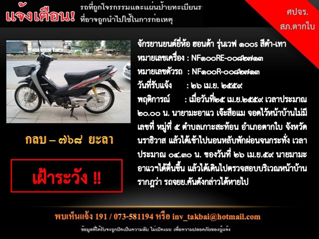 รถจักรยานยนต์ ฮอนด้าเวฟ 100s สีดำ-เทา ทะเบียน กลบ 768 ยะลา (แจ้งหายเมื่อวันที่ 22 เม.ย.59)