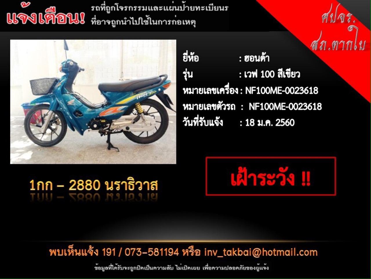 รถจักรยานยนต์ ฮอนด้าเวฟ 100 สีเขียว ทะเบียน 1 กก 2880 นราธิวาส (แจ้งหายเมื่อวันที่ 18 มี.ค.60)