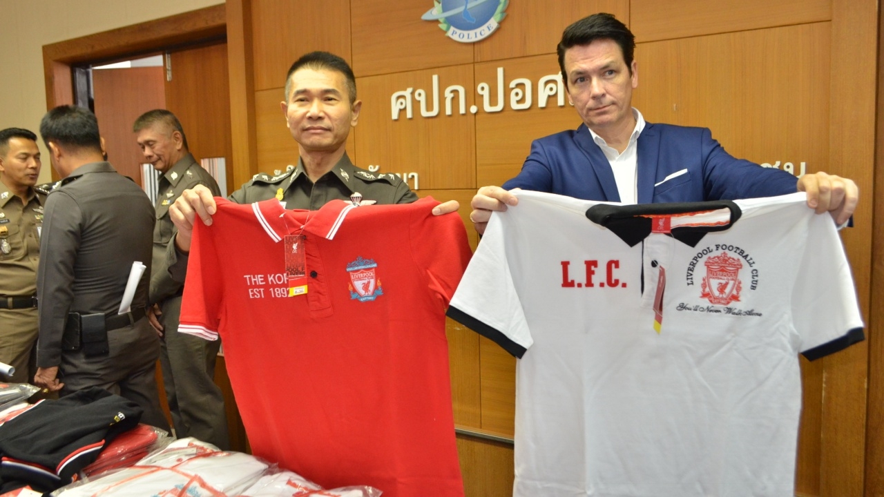 ตำรวจ ปอศ. แถลงจับกุมเสื้อผ้าละเมิดลิขสิทธิ์ ยี่ห้อลิเวอร์พูล กว่า 1,154 ตัว มูลค่าความเสียหายกว่า 2 ล้านบาท ด้านตัวแทนสโมสร ฝากแฟนเดอะค็อปชาวไทย สนับสนุนสโมสรที่เรารัก ร่วมกันใช้สินค้าที่มีลิขสิทธิ์