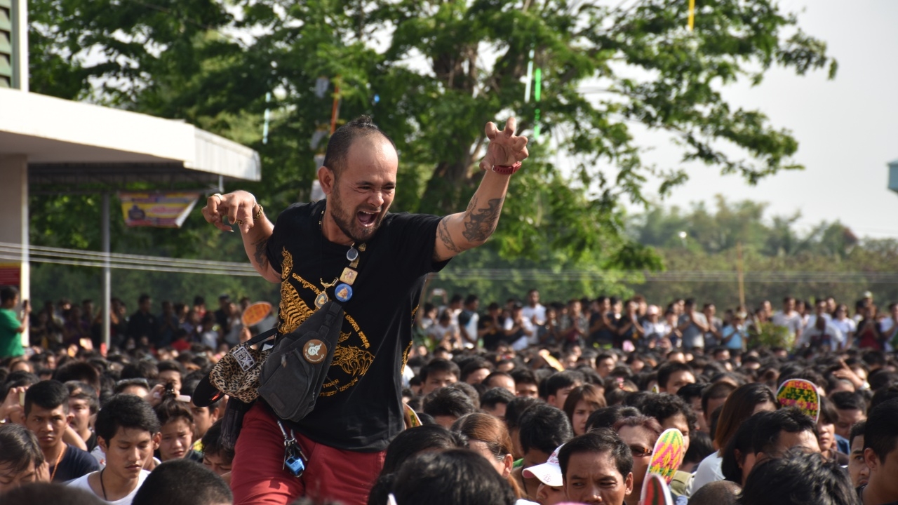 ศิษย์ ‘หลวงพ่อเปิ่น วัดบางพระ’ นับหมื่นชีวิต แห่ร่วมพิธีไหว้ครูสักยันต์เสือเผ่น สุดอัศจรรย์! ของขึ้น-หวีดร้องกลางลานวัด ท่ามกลางสภาพอากาศที่ร้อนจัด โดยมีกำลังทหารคอยดูแลความสงบเรียบร้อย