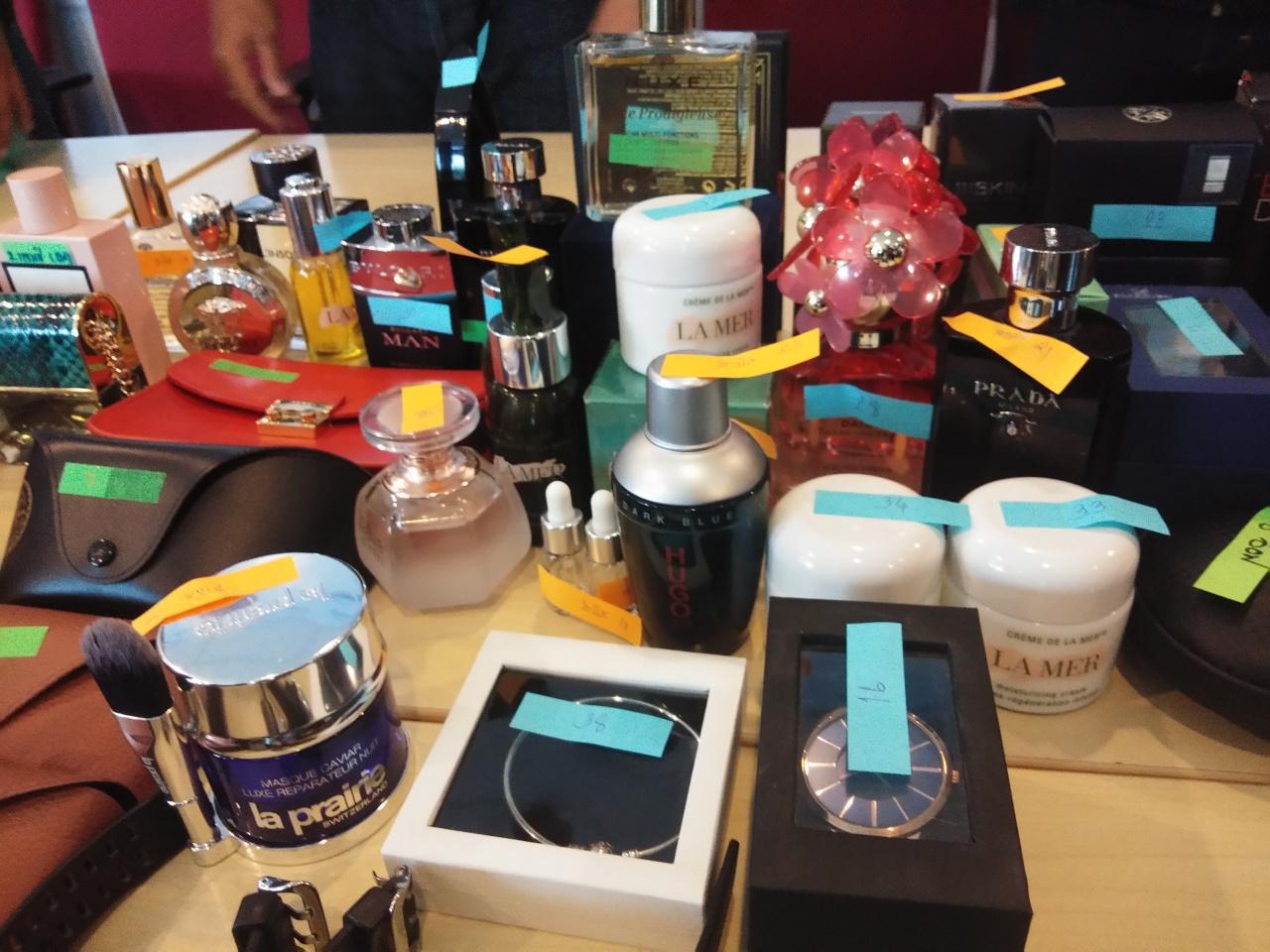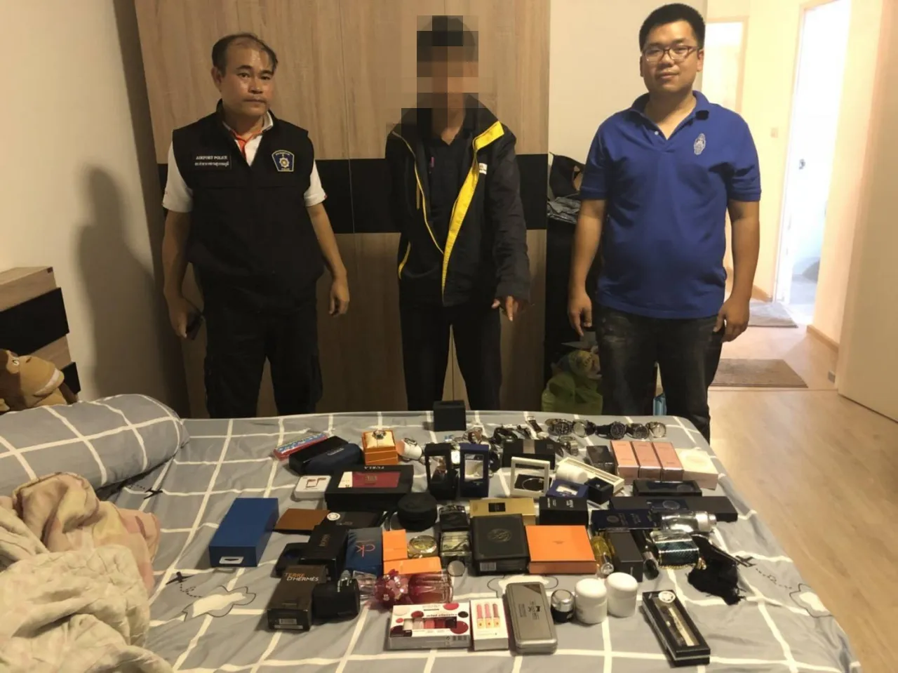 พร้อมของกลางสินค้าแบรนด์เนม จำพวกนาฬิกา น้ำหอม กระเป๋า เครื่องสำอาง รวมจำนวน 181 รายการ มูลค่าประมาณ 1 ล้านบาท โดยจับกุมได้ที่ สภ.ท่าอากาศยานสุวรรณภูมิ(ส่วนหลัง) ต.หนองปรือ อ.บางพลี จ.สมุทรปราการ