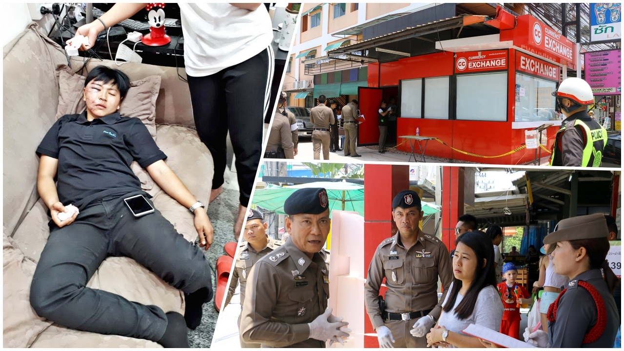 เมื่อช่วงเช้า วันที่ 14 เม.ย. 61 พ.ต.อ.อาทร ชิ้นทอง ผกก.สภ.นาจอมเทียน ร.ต.อ.หญิง ลลิตา เณรพงษ์ รอง สว.สอบสวน สภ.จอมนาจอมเทียน พร้อมกำลังเจ้าหน้าที่ตำรวจชุดสืบสวนภูธรจังหวัดชลบุรี ตำรวจ ตม.จ.ชลบุรี ตำรวจท่องเที่ยวเมืองพัทยา เจ้าหน้าที่วิทยาการ กองพิสูจน์หลักฐาน ชลบุรี ร่วมตรวจสอบบูธแลกเงินตราต่างประเทศ ตั้งอยู่ริมถนนสุขุมวิท ตรงข้ามโรงแรมแอมบาสซาเดอร์ จอมเทียน หมู่ที่ 2 ต.นาจอมเทียน อ.สัตหีบ จ.ชลบุรี หลังได้รับแจ้งมีชาวต่างชาติเข้าไปทำร้ายพนักงานสาวแลกเงินบาทเจ็บสาหัส ชิงเงินสดเกือบ 1 ล้านบาท