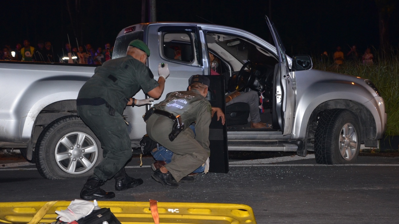 ที่เกิดเหตุพบรถยนต์กระบะยี่ห้ออีซูซุ ดีแมกซ์ ตอนครึ่ง สีบรอนซ์เงิน ทะเบียน ผจ 4099 นครศรีธรรมราช จอดอยู่ชิดเกาะกลางจุดยูเทิร์นฝั่งขาเข้าเมือง โดยพบยางล้อรถทั้ง 4 เส้น ถูกเจ้าหน้าที่ยิงจนแตก ด้านข้างรถทั้งด้านซ้ายและขวา มีรอยถูกกระสุนปืนจนฉีกขาดเกือบ 10 แห่ง