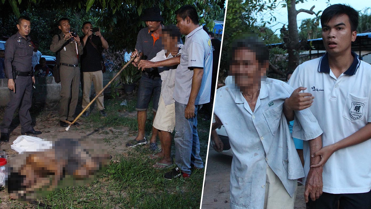 ที่เกิดเหตุเป็นบ้านไม่มีเลขที่ พบศพ นายสุรชิต วิเศษโมรา อายุ 55 ปี นอนเสียชีวิตอยู่หน้าบันไดบ้าน สภาพถูกแทงด้วยเหล็กก้านร่ม ปักเข้าสะบักซ้าย ในมือขวาของผู้ตายยังถือมีดไว้อยู่ โดยมีนายส่อน เฉลิมชัย อายุ 89 ปี เจ้าของบ้าน หลังเกิดเหตุยืนถือไม้เท้า ยาวประมาณ 1 เมตร รอมอบตัวกับตำรวจ