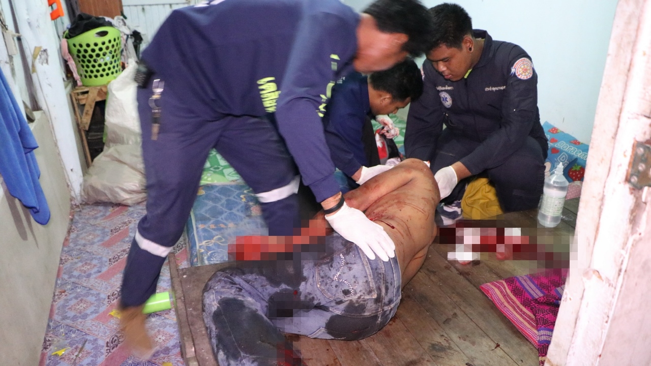 ที่เกิดเหตุ พบนายทองแดง สวัสดิรัมย์ อายุ 46 ปี นอนจมกองเลือดอยู่บนเตียงภายในห้อง อาการสาหัส ที่ศีรษะมีบาดแผลฉกรรจ์ และมีอาการมึนเมาอย่างหนัก เจ้าหน้าที่ต้องเร่งปฐมพยาบาลก่อนนำส่งโรงพยาบาลบางปะกง