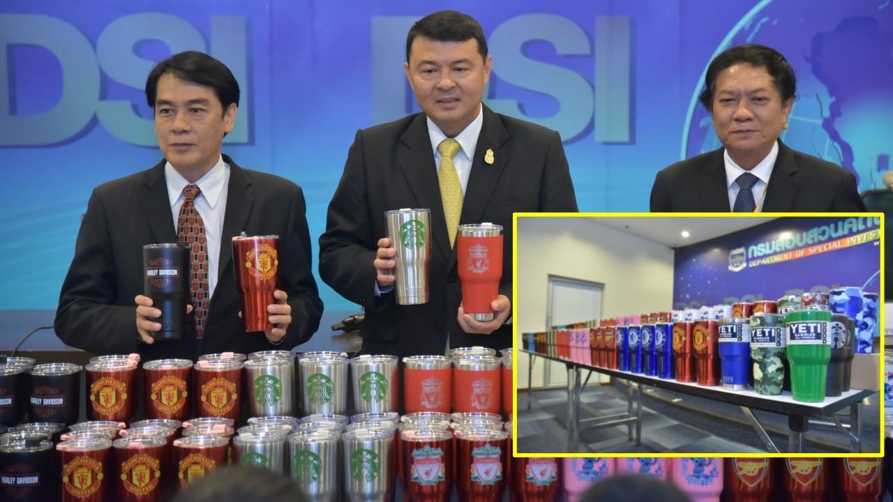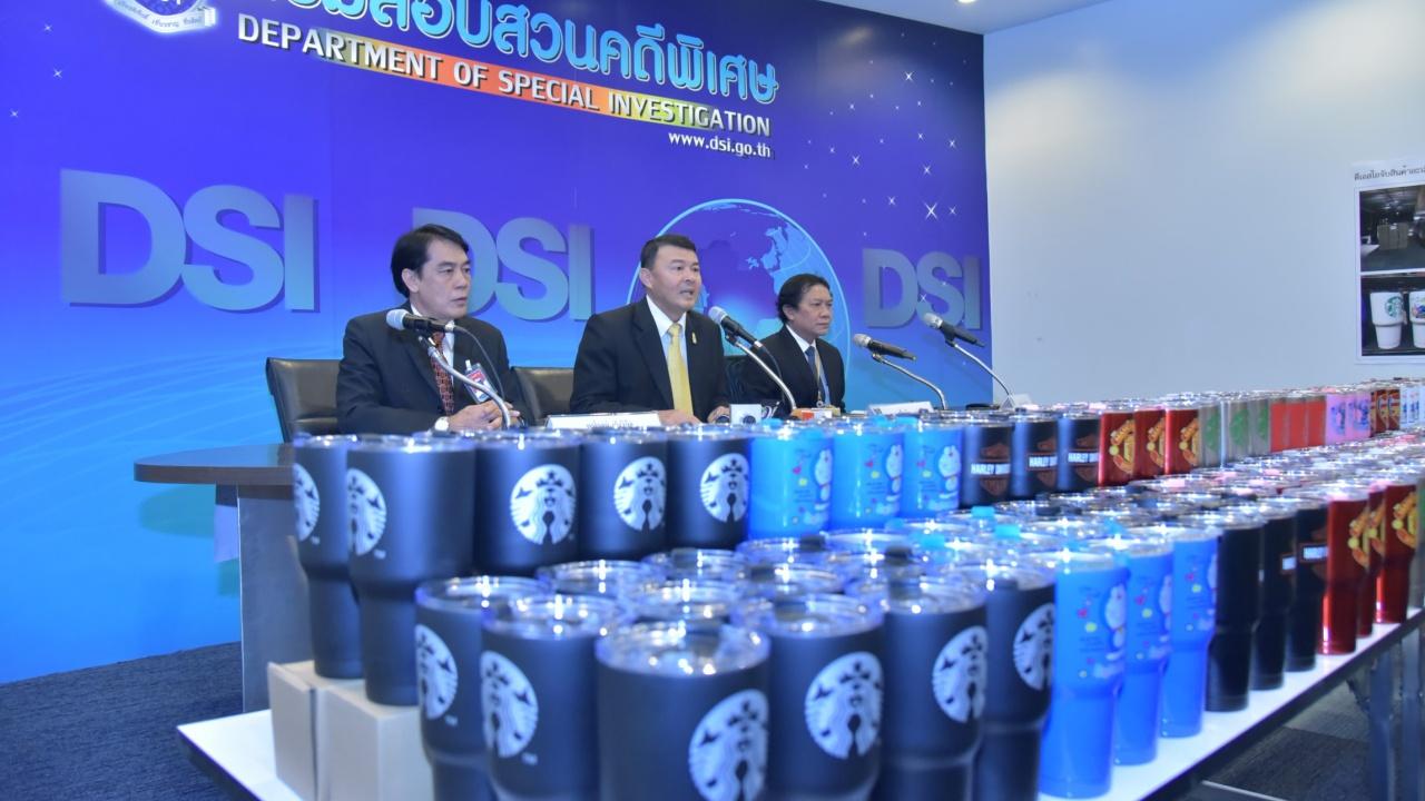 “ดีเอสไอ” กางโต๊ะแถลงผลทลายโกดังย่านสำเพ็ง 10 จุด จับแก้วน้ำปลอมแบรนด์ดัง ละเมิดลิขสิทธิ์กว่า 6 หมื่นชิ้น มูลค่า 10 ล้านบาท แต่ถ้าเป็นของแท้จะมีมูลค่ากว่า 60 ล้าน พร้อมจับกุม 9 ผู้ต้องหา