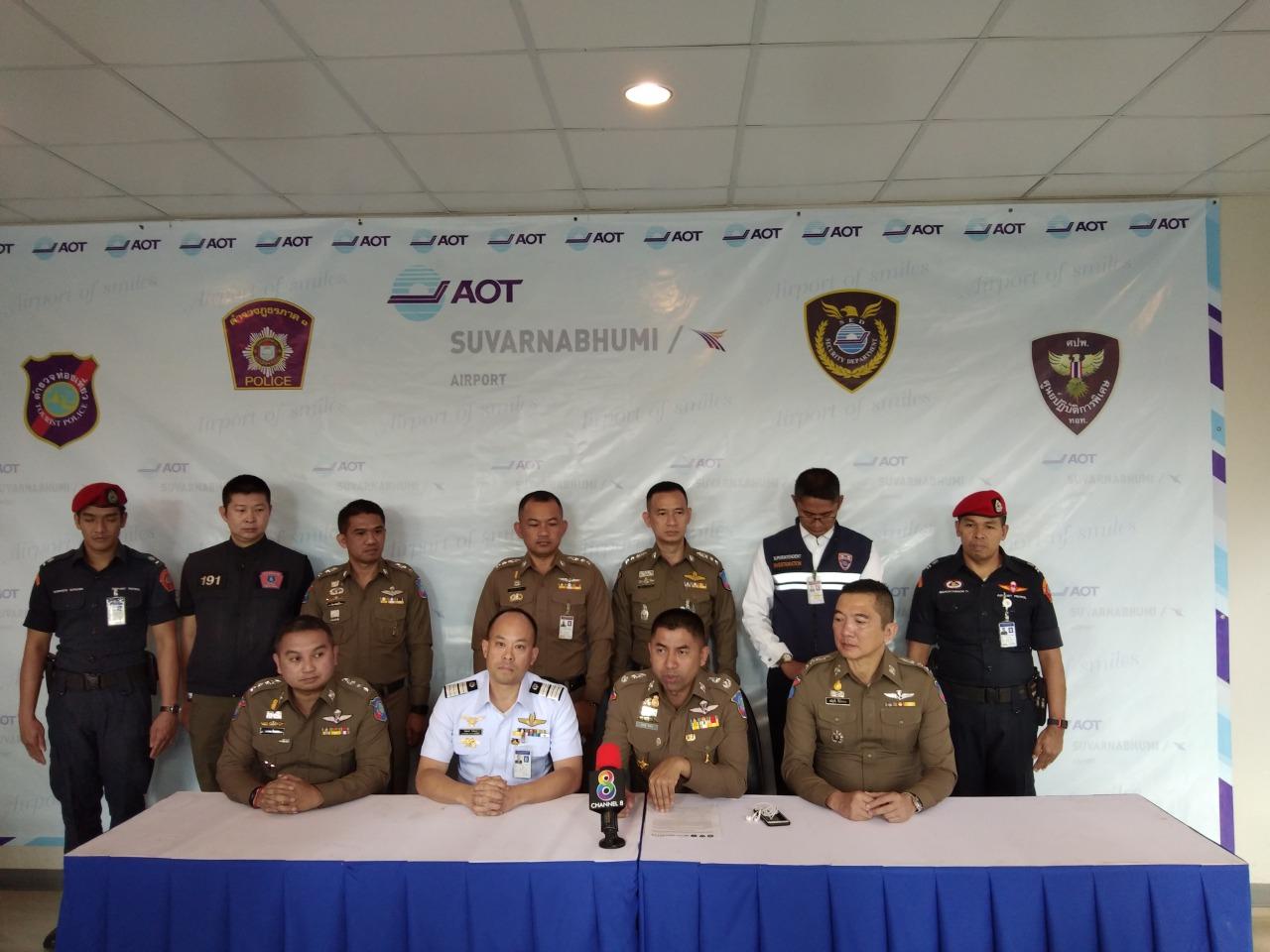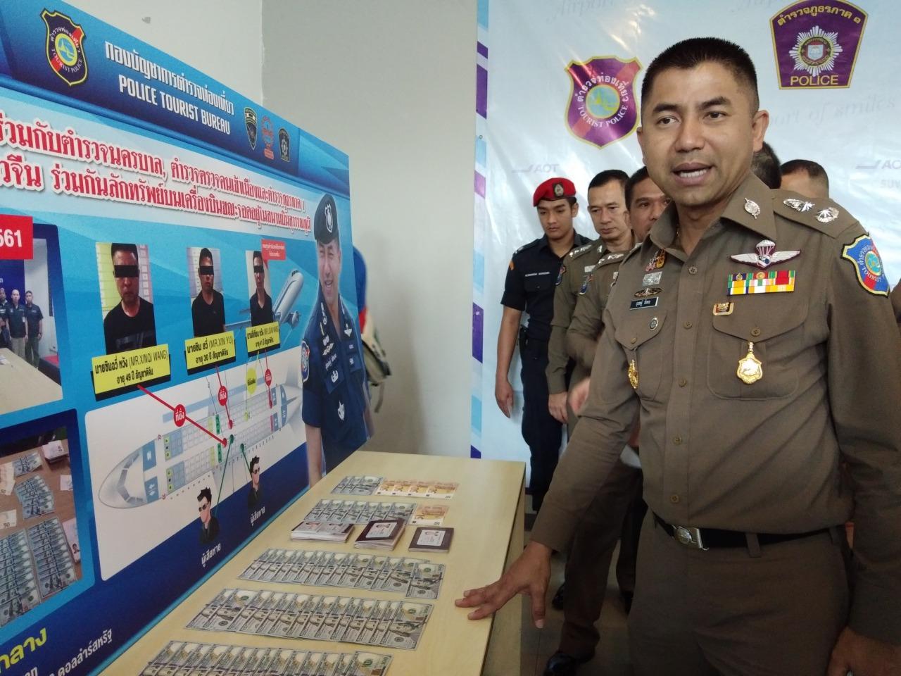 เมื่อวันที่ 25 มิ.ย.61 ที่ห้องประชุมชั่วคราว สภ.ท่าอากาศยานสุวรรณภูมิ อ.บางพลี จ.สมุทรปราการ พล.ต.ต.สุรเชษฐ์ หักพาล รอง ผบช.ทท. นายกิตติพงษ์ กิตติขจร รอง ผอ.การท่าอากาศยานสุวรรณภูมิ พ.ต.อ.อาชยน ไกรทอง รอง ผบก.ทท.1 พ.ต.อ.อำนาจ โฉมฉาย ผกก.3 บก.ทท.1 พ.ต.อ.วิโรจน์ ตัดโส ผกก.สภ.ท่าอากาศยานสุวรรณภูมิ พ.ต.อ.เพลิน กลิ่นพะยอม ผกก.ปป.บก.ตม.2 พร้อมหน่วยงานที่เกี่ยวข้องร่วมกันแถลงผลการจับกุมแก๊งชาวจีน-เหอหนาน ก่อเหตุลักทรัพย์บนเครื่องบิน 3 คน ประกอบด้วย นายชิน ยวี่ (MR.XIN YU) อายุ 30 ปี สัญชาติจีน นายซินฉวี่ หวัง (MR.XINQI WANG) อายุ 49 ปี สัญชาติจีน และนายลี่เชียน หวัง (MR.LIQIAN WANG) อายุ 41 ปี สัญชาติจีน พร้อมของกลางเป็นเงินสด ธนบัตร 100 ดอลลาร์สหรัฐฯ จำนวน 52 ใบ, ธนบัตร 50 ยูโร จำนวน 5 ใบ, ธนบัตร 5 ยูโร จำนวน 1 ใบ เป็นเงินไทยประมาณ 150,000 บาท โดยจับกุมนายชิน ยวี่ และนาย ซินฉวี่ หวัง ได้ที่ช่องทางเทียบเครื่องบิน Bus Gate ผู้โดยสารขาเข้า อาคารผู้โดยสารท่าอากาศยานสุวรรณภูมิ และตามจับกุมนายลี่เชียน หวัง ได้ที่ กก.3 บก.ทท.1 (ท่าอากาศยานสุวรรณภูมิ)