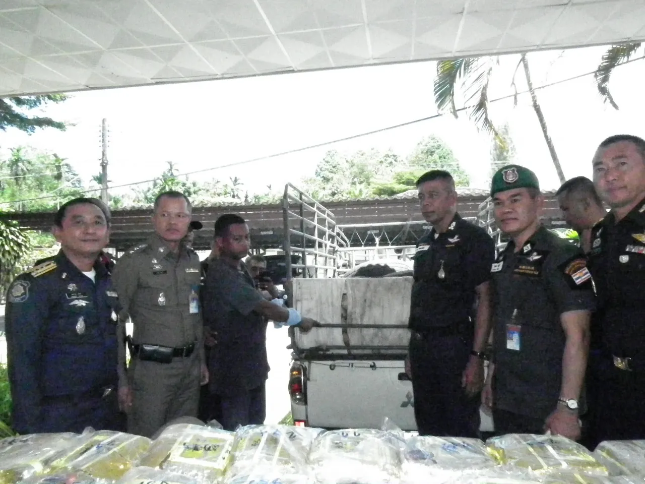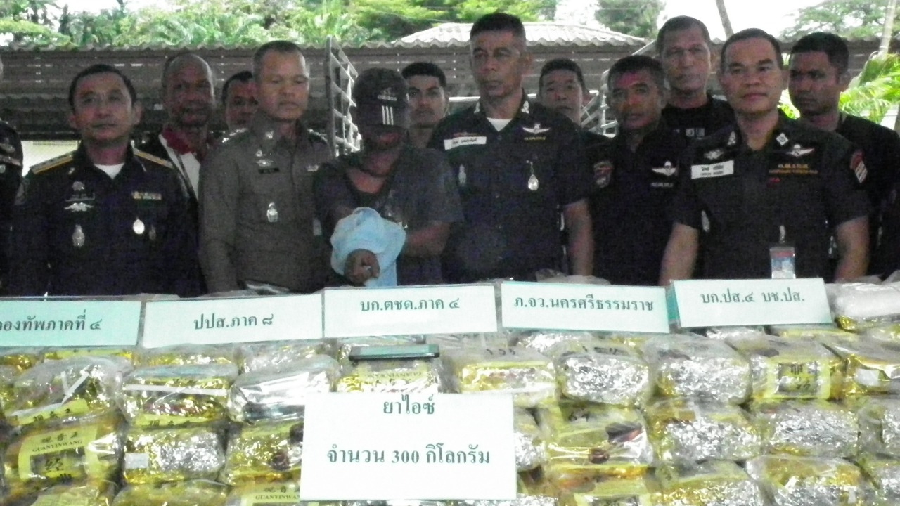 ที่กองกำกับการตำรวจตระเวนชายแดนที่ 42 ค่ายศรีนครินทรา อ.ทุ่งสง จ.นครศรีธรรมราช เมื่อเวลา 11.00 น. วันที่ 26 ก.ย.2561 นี้ พ.ต.อ.นิคม พลประสิทธิ์ รอง ผบก.ตชด.ภาค 4 พ.ต.อ.สมยศ สีหาบัว ผกก.สภ.จุฬาภรณ์ พ.ต.อ.โชคดี ศรีเมือง ผกก.สส.ภ.จว.นครศรีธรรมราช พ.อ.ธวัชชัย ทับทิมสงวน หัวหน้าชุดรักษาความสงบ กองทัพภาคที่ 4 ร่วมกันแถงข่าวตำรวจจับกุมไอซ์รายใหญ่น้ำหนัก 300 กิโลกรัม ราคา 600 ล้านบาท