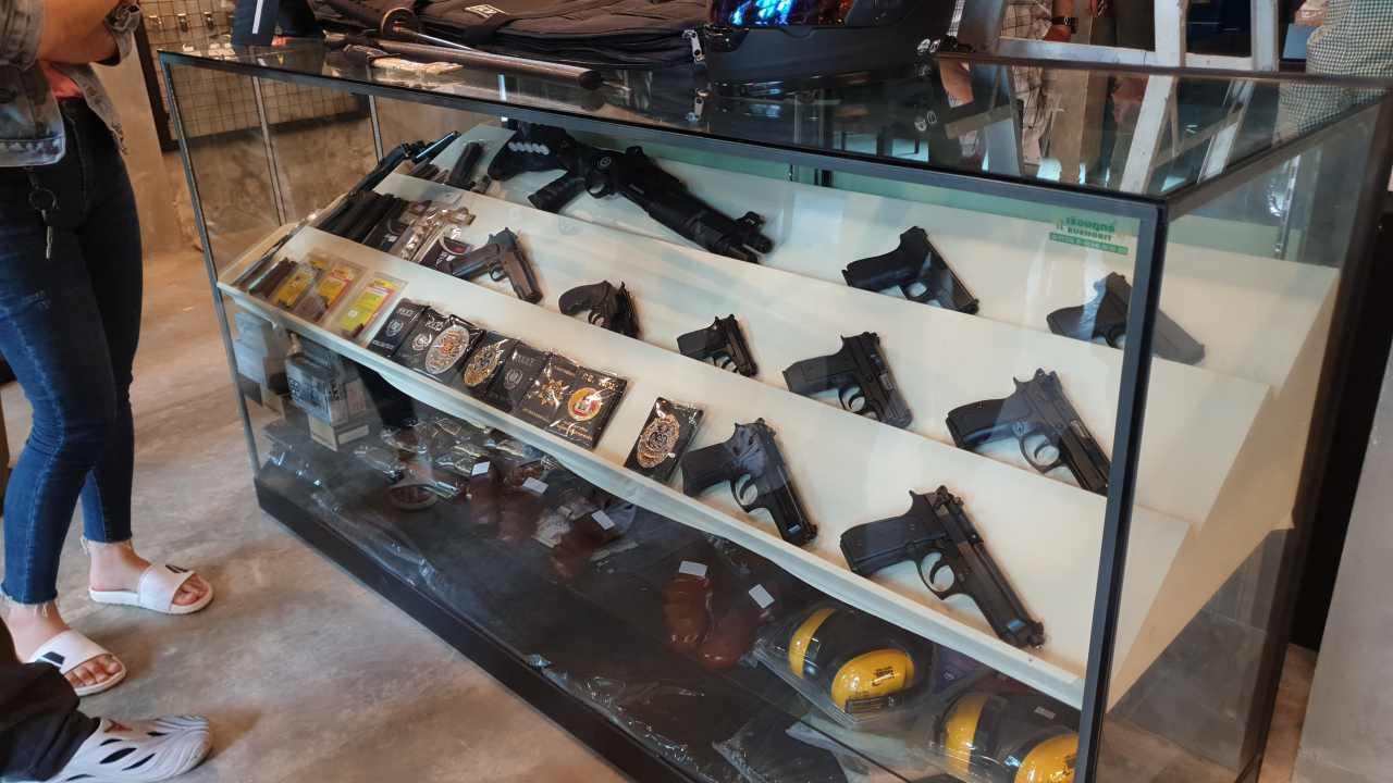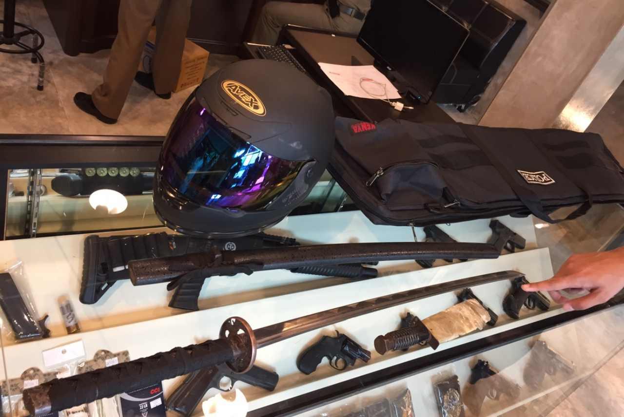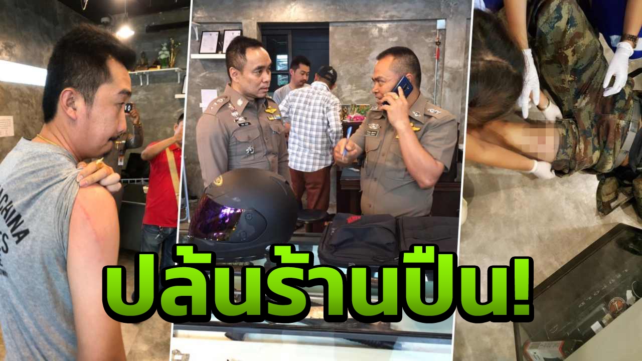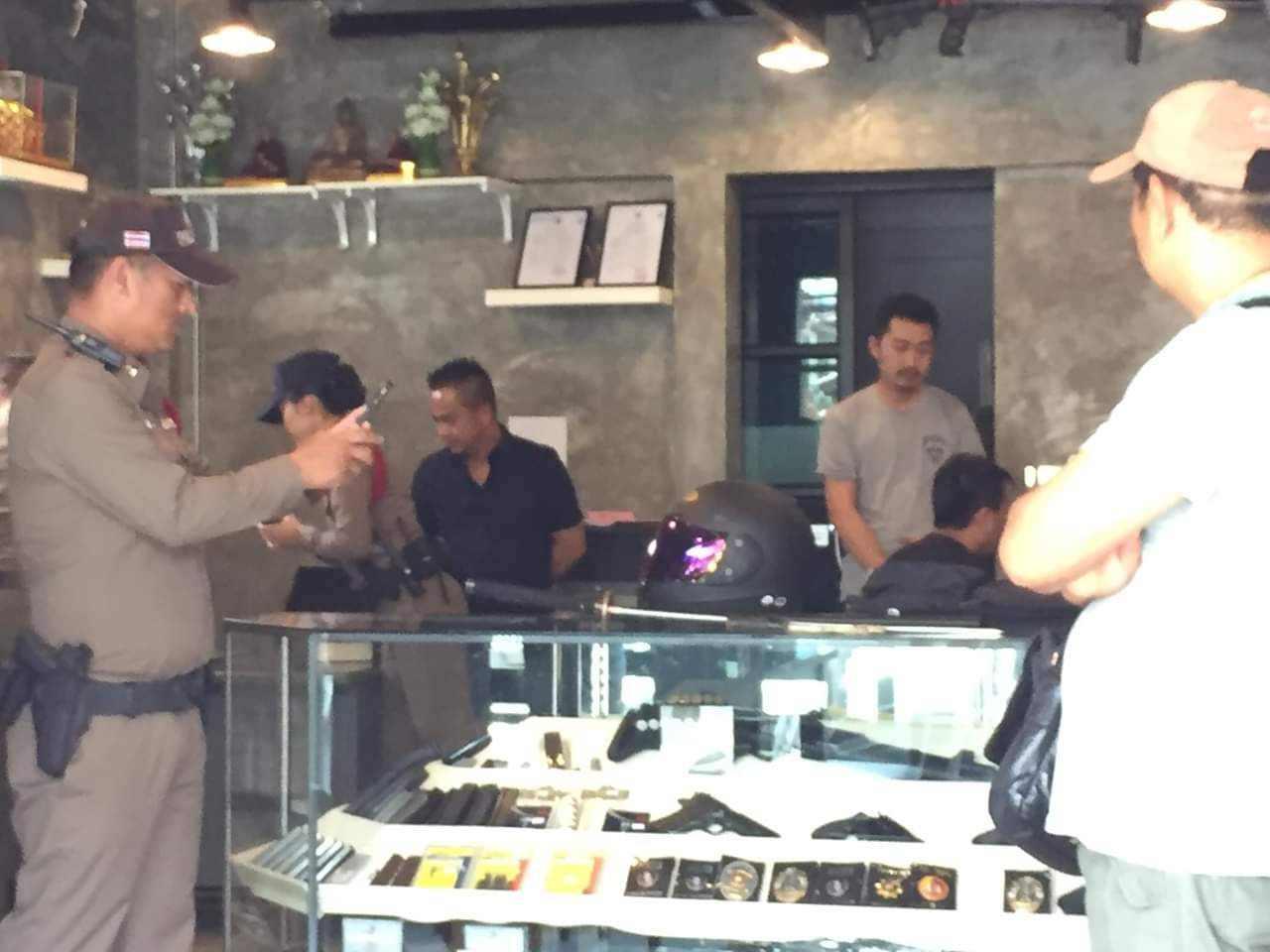 สอบถามเบื้องต้นนายวิรุฬ เพชรลูกอินทร์ อายุ 38 ปี พนักงานประจำร้านเล่าว่า ขณะเกิดเหตุ คนร้ายทั้ง 2 คนขี่รถจักรยานยนต์ฮอนด้า เวฟ สีแดง-ดำ ไม่ติดแผ่นป้ายทะเบียนมาจอดที่หน้าร้าน จากนั้นทั้งคู่เดินเข้ามา ผู้ชายสวมชุดพรางทหารทั้งเสื้อกางเกง ใส่หมวกโม่ง หมวกกันน็อกเต็มใบปิดบังใบหน้าและสะพายกระเป๋าขนาดใหญ่เดินเข้ามาในร้าน ผู้หญิงสวมเสื้อผ้าปกติไม่อำพรางใบหน้า ครั้งแรกตนคิดว่าเป็นเจ้าหน้าที่ทหารเข้ามาดูอาวุธปืนจึงไม่ได้ทักท้วง แต่ปรากฏคนร้ายชายวางกระเป๋าบนตู้โชว์ปืน และหยิบมีดดาบซามูไรยาวประมาณ 1 เมตร ออกมาขู่ บอกให้ตนนำอาวุธปืนทั้งหมดในตู้โชว์ใส่กระเป๋า ตนจึงเดินถอยหลังให้พ้นระยะมีดดาบ และบอกให้นายทวีศักดิ์ ปิติปฏิมารัตน์ อายุ 32 ปี พนักงานดูแลร้านที่ยืนอยู่ด้านหลังระวังตัว คนร้ายจึงวิ่งอ้อมตู้โชว์ไปหานายทวีศักดิ์