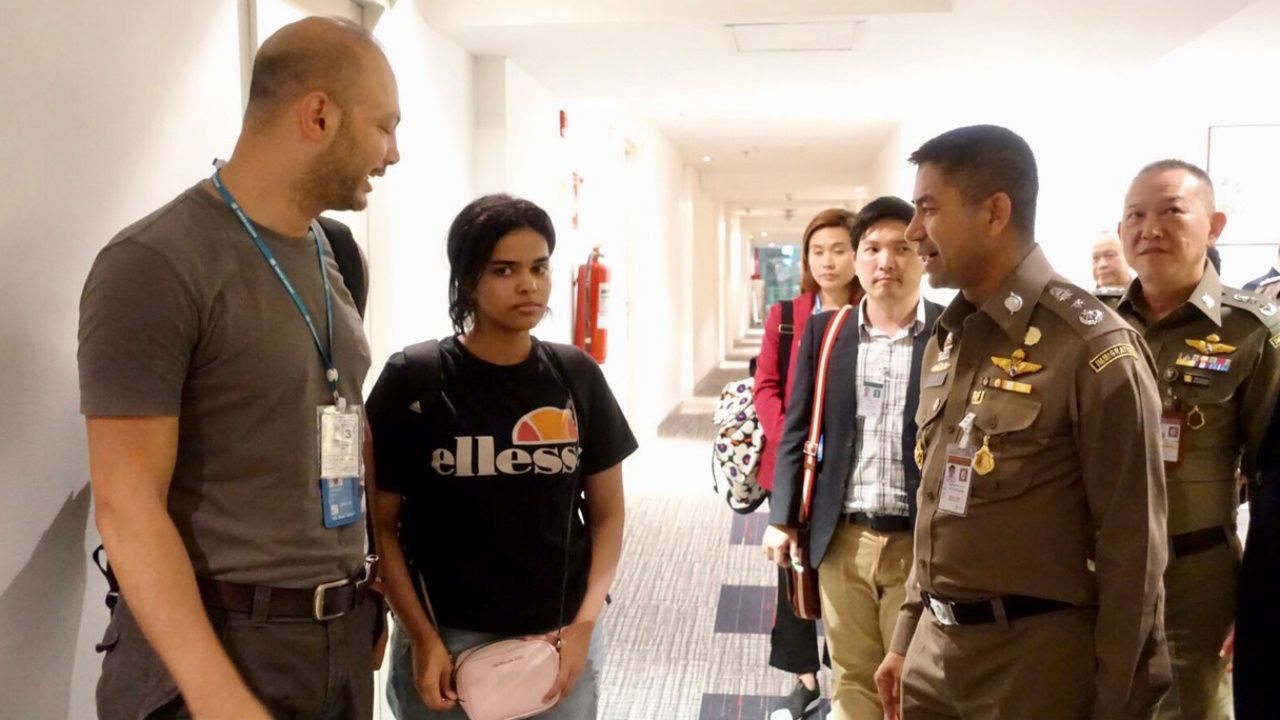 เมื่อเวลา 17.15 น. วันที่ 7 ม.ค.62 ภายหลัง พล.ต.ท.สุรเชษฐ์หักพาล ผบช.สตม. พร้อมด้วย นายจูเซฟเป้ เดอ วินเซนทิส ผู้แทน UNHCR ประจำประเทศไทย นายกิตติพงษ์ กิตติขจร รอง ผอ.ท่าอากาศยานสุวรรณภูมิ พล.ต.ต.พฤทธิพงษ์ ประยูรศิริผบก.ตม.2 พร้อมเจ้าหน้าที่ UNHCR และหน่วยงานที่เกี่ยวข้อง ได้เดินทางเข้าไปยังโรงแรมมิราเคิล ทรานสิทแอนด์ สปา ซึ่งอยู่ด้านในอาคารผู้โดยสาร บริเวณคองคอร์ด G เพื่อทำการพูดคุย กับ น.ส.ราฮาฟ โมฮัมเหม็ด เอ็ม อัลคูนัน อายุ 18 ปี สัญชาติ ซาอุดิอาระเบีย โดยใช้เวลาราว 2 ชั่วโมงในการพูดคุย จนกระทั่งได้ข้อสรุปเป็นที่เรียบร้อย