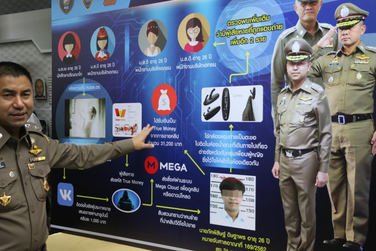 พล.ต.ท.สุรเชษฐ์ กล่าวว่า สืบเนื่องจาก ศปอส.ตร. ได้รับการร้องเรียนจากน.ส.แพรว อายุ 26 ปี นักศึกษาปริญญาโท และน.ส.แพน อายุ 26 ปี พนักงานบริษัทเอกชนแห่งหนึ่ง ว่ามีคลิปวิดีโอของตนในลักษณะอาบน้ำ ความยาวประมาณ 3-5 นาที จำนวน 6 คลิป ไปปรากฏในแอปพลิเคชันสังคมออนไลน์ ชื่อวีเค (VK) โดย 3 คลิปแรกเป็นภาพของน.ส.แพรว และน.ส.แพน ถูกนำไปรวมกับคลิปอื่นๆ เป็นคลิปในลักษณะแอบถ่ายใต้กระโปรงตามที่สาธารณะ ชุดสืบสวนจึงได้ทำการตรวจสอบก็พบว่าเป็นข้อมูลจริง ซึ่งในแอปดังกล่าวได้มีการระบุว่าหากอยากรับชมอีก 3 คลิปเพิ่มให้จ่ายเงินค่าสมัครสมาชิกจำนวน 300 บาท ผ่านทรูมันนี่ จากนั้นก็จะมีการเชิญเข้ากลุ่มไลน์ ซึ่งมีสมาชิกกว่าร้อยคน โดยคนร้ายมีการทำหน้าที่เป็นแอดมิน จึงได้ทำการสืบสวนจนพบว่าผู้ก่อเหตุคือนายภัคพิสิษฐ์ จนสามารถติดตามตัวได้ที่คอนโดฯ แห่งหนึ่งย่านสุทธิสาร