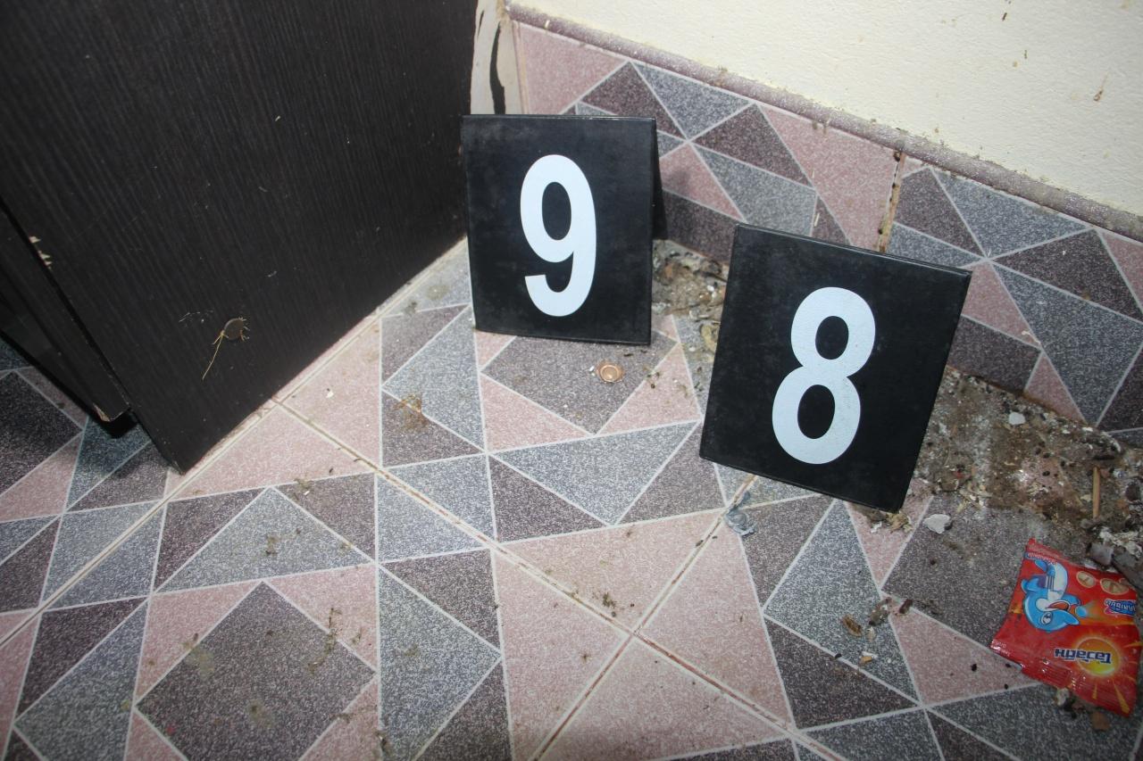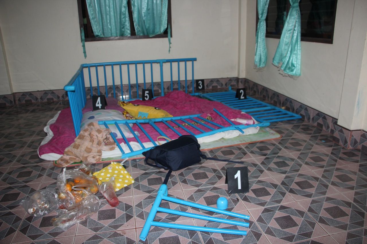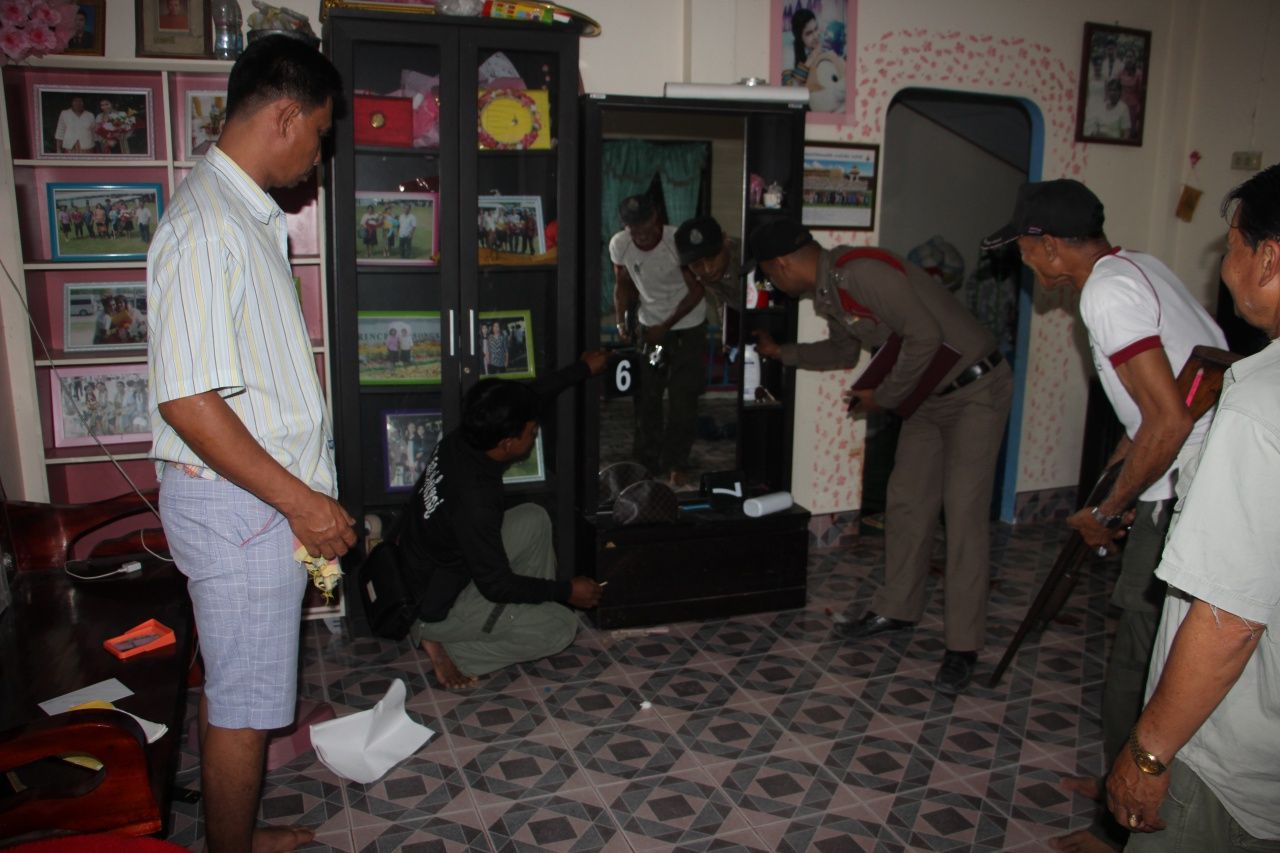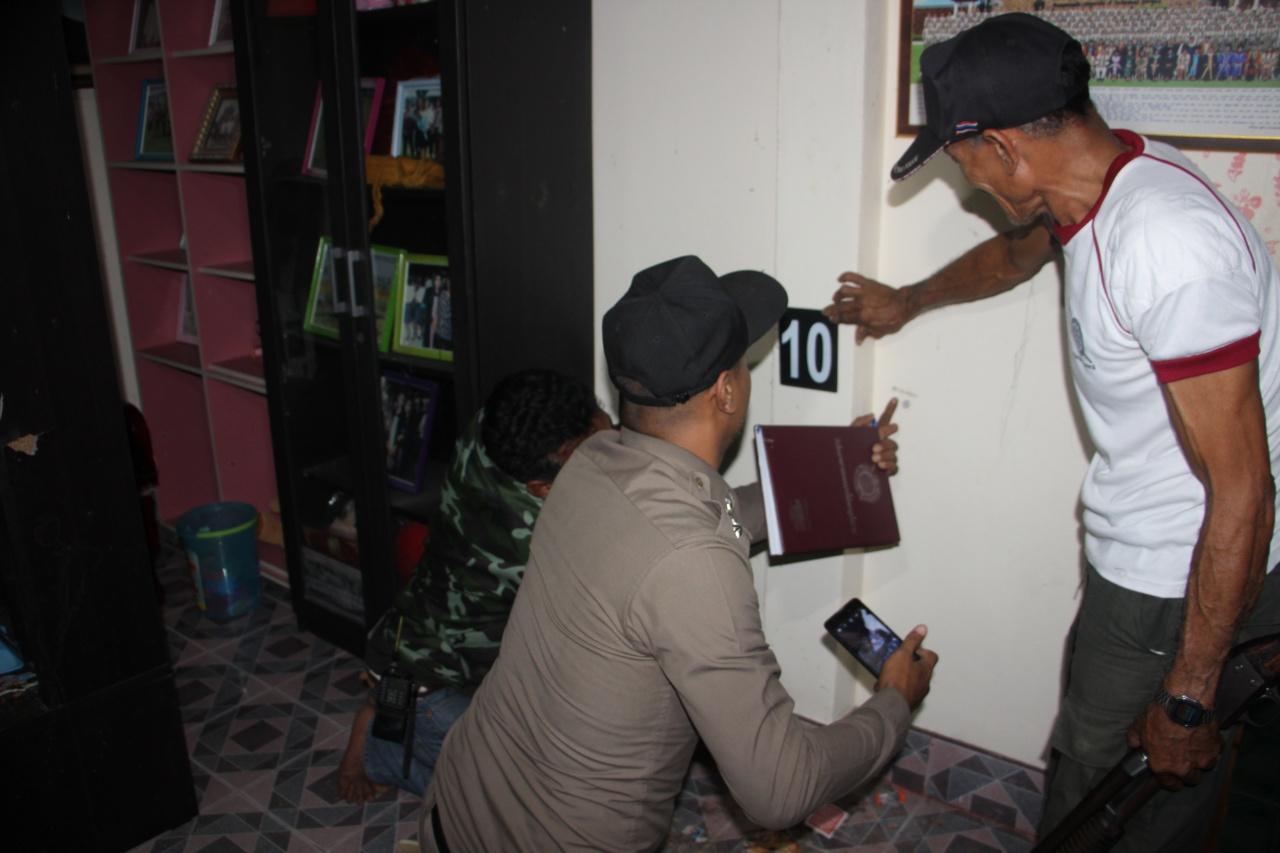 ที่เกิดเหตุเป็นบ้านปูนชั้นเดียวภายในบ้านบริเวณห้องโถง พบท่อพีวีซีที่ทำเป็นกรงสี่เหลี่ยมสำหรับเลี้ยงเด็กเล็กให้เล่นอยู่ข้างในแตกหักพังเสียหาย นอกจากนี้ยังมีส้มเขียวหวาน ถุงขนม และแก้วน้ำชาเย็นตกกระจาย ใกล้กันพบปลอกกระสุนปืนขนาด 9 มม.ตกอยู่จำนวน 6 ปลอก และที่บริเวณตู้กระจกทางเข้าห้องครัวพบหัวกระสุนปืนขนาด 9 มม.ตกอยู่ 2 หัว เมื่อเดินเข้าไปตรวจสอบตรงประตูทางเข้าห้องครัวพบคราบเลือดและกองเลือดกองใหญ่ตกกระจายทั่วพื้นบ้าน นอกจากนี้ยังพบหัวกระสุนชนิดเดียวกันที่ยิงไปถูกกำแพงห้องครัวอีก 1 หัว จึงได้เก็บไว้เป็นหลักฐานทั้งหมด ส่วนคนเจ็บญาติๆที่อยู่ในที่เกิดเหตุได้ช่วยกันนำส่ง รพ.ทุ่งสง