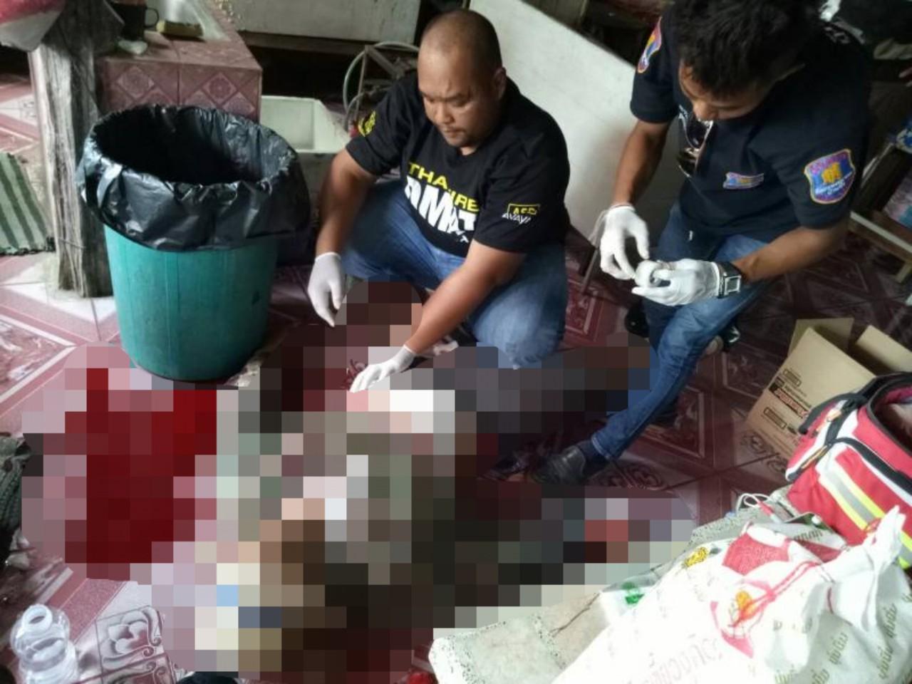 ต่อมาเจ้าหน้าที่ตำรวจก็ได้รับแจ้งว่ามีผู้ก่อเหตุใช้อาวุธมีดแทงตัวเอง ซึ่งเป็นคนเดียวกับที่ก่อเหตุใช้อาวุธปืนยิงผู้ได้รับบาดเจ็บ เหตุเกิดภายในร้านขายอาหารตามสั่ง ฝั่งตรงข้ามวัดพันเสร็จใน พื้นที่ ม.4 ต.บ่อวิน อ.ศรีราชา จ.ชลบุรี เจ้าหน้าที่จึงรีบรุดไปตรวจสอบ เมื่อเดินทางไปถึงพบ นายบุญลอง ปุ่กเป็ด อายุ 42 ปี ชาวบ้าน ม.2 ต.สวนเมี่ยง อ.ชาติตระการ จ.พิษณุโลก นอนหงายหน้าจนกองเลือดอยู่ พบบาดแผลถูกอาวุธมีดทำครัว แทงเข้าที่บริเวณหน้าท้อง จนได้รับบาดเจ็บสาหัส เจ้าหน้าที่จึงได้รีบปฐมพยาบาลเบื้องต้น ก่อนนำตัวส่งโรงพยาบาลแหลมฉบัง