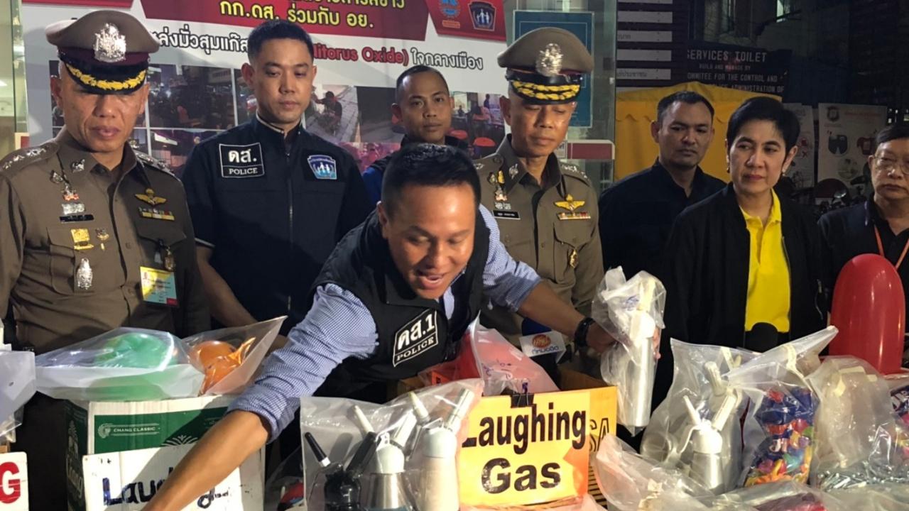 ตำรวจดส. ร่วมมืออย. แถลงผลจับ 9 ผู้ต้องหา ลักลอบขายลูกโป่งบรรจุ “แก๊สหัวเราะ” ให้กับนักท่องเที่ยวต่างชาติบนถนนข้าวสาร เผยสูดดมแล้วเคลิบเคลิ้ม-อารมณ์ดี แพทย์เตือนร้ายแรงสุดมีโอกาสเสียชีวิตได้